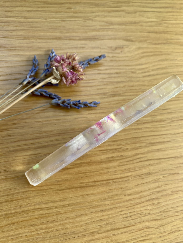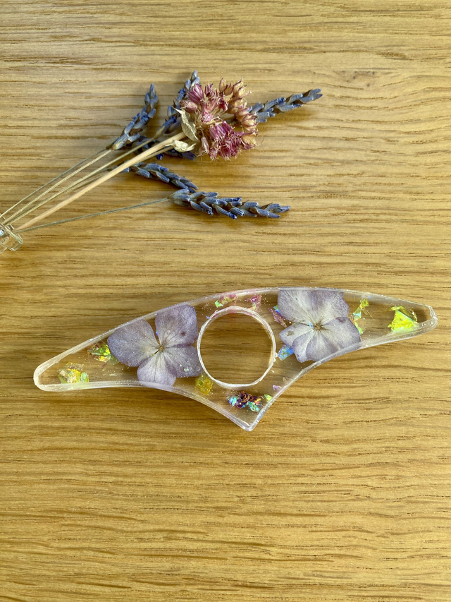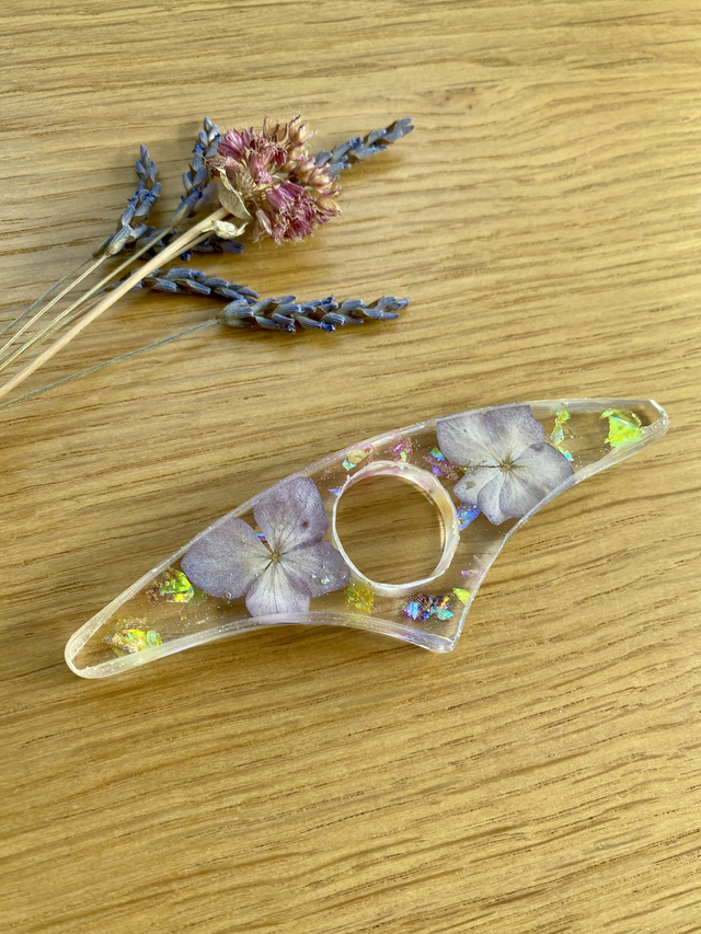 Bague de lecture incrustée d'hortensia, flocons violets et verts.
