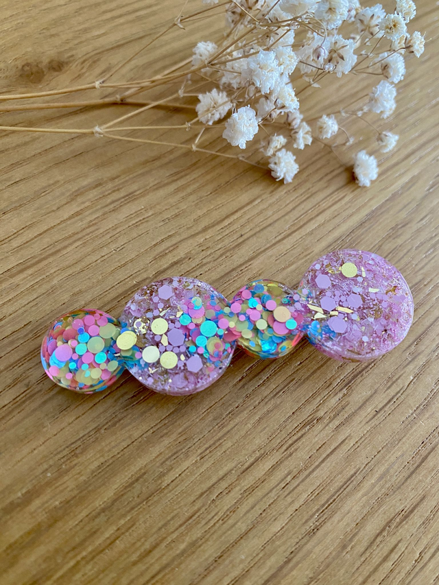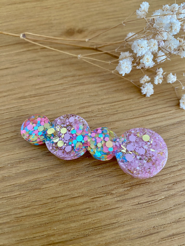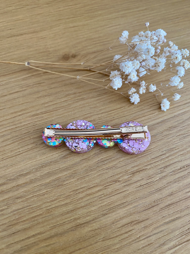 Barrettes modèle Albertine, incrustées de paillettes lilas et pastel (rose, bleu, jaune).