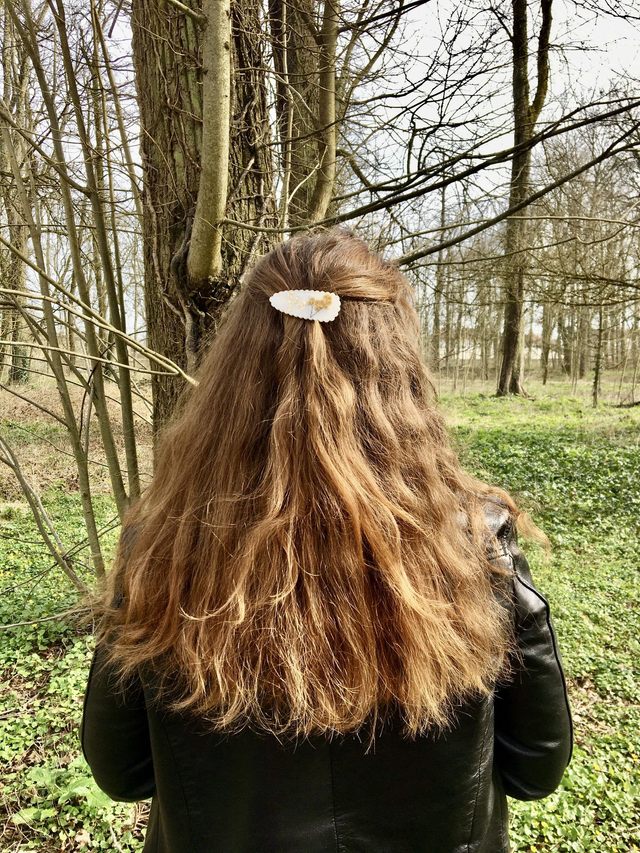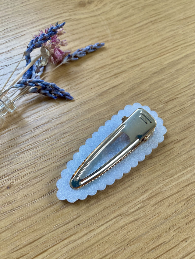 Barrette modèle Andrea gaufré, incrustée de mimosa et flocons dorés.
