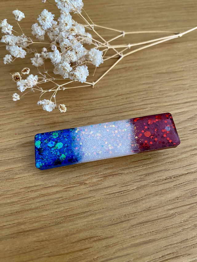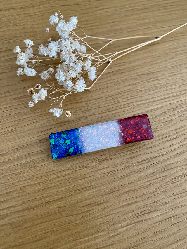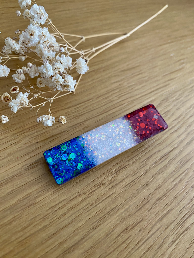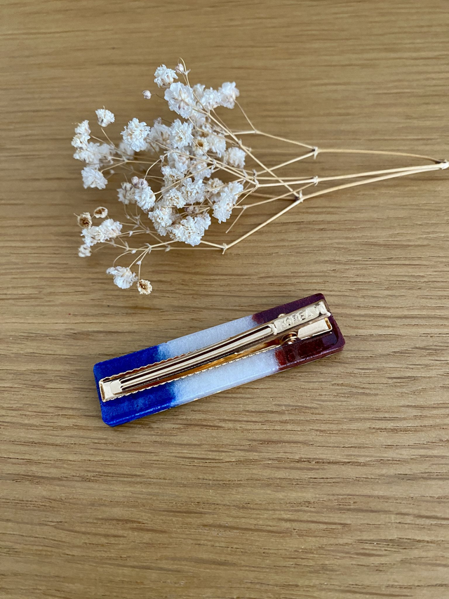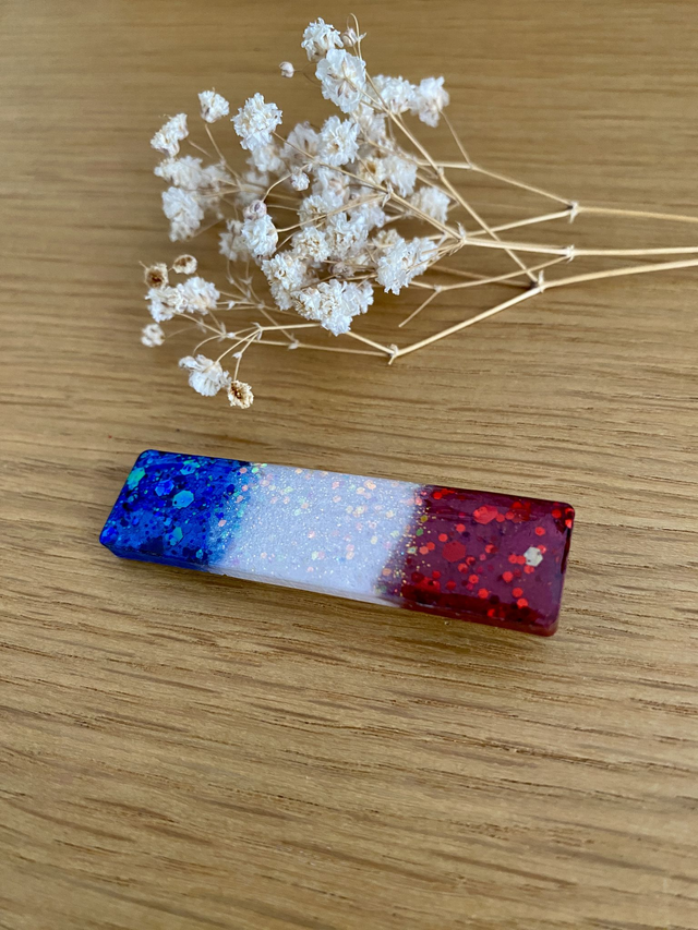 Barrette modèle Clémence, pigments et paillettes aux couleurs de notre drapeau Français.