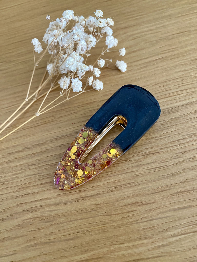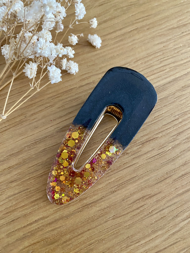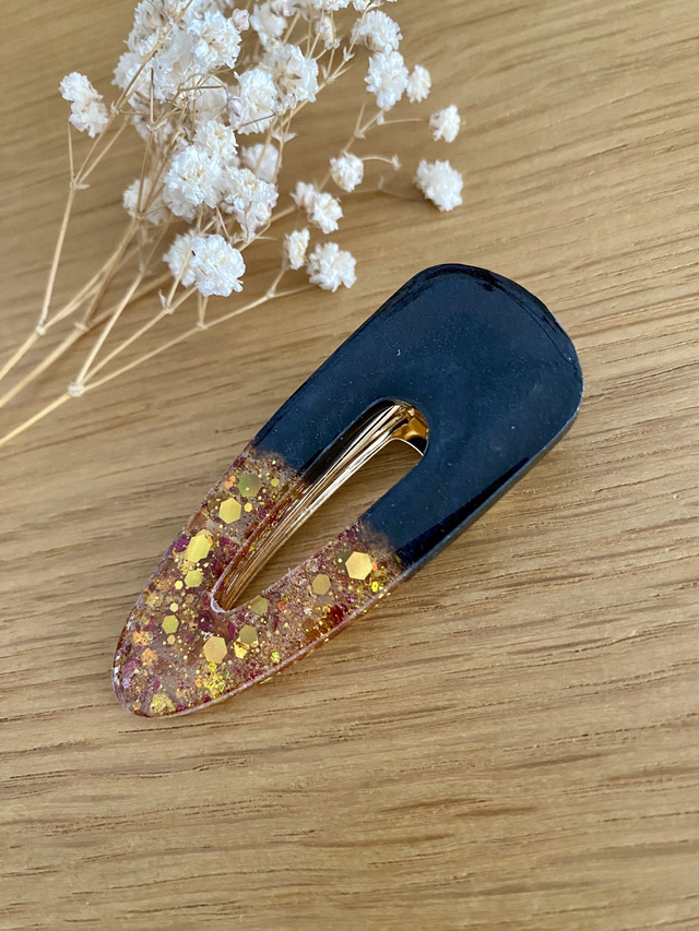 Barrette modèle Theresia, paillettes chunky or et pigments obsidienne.