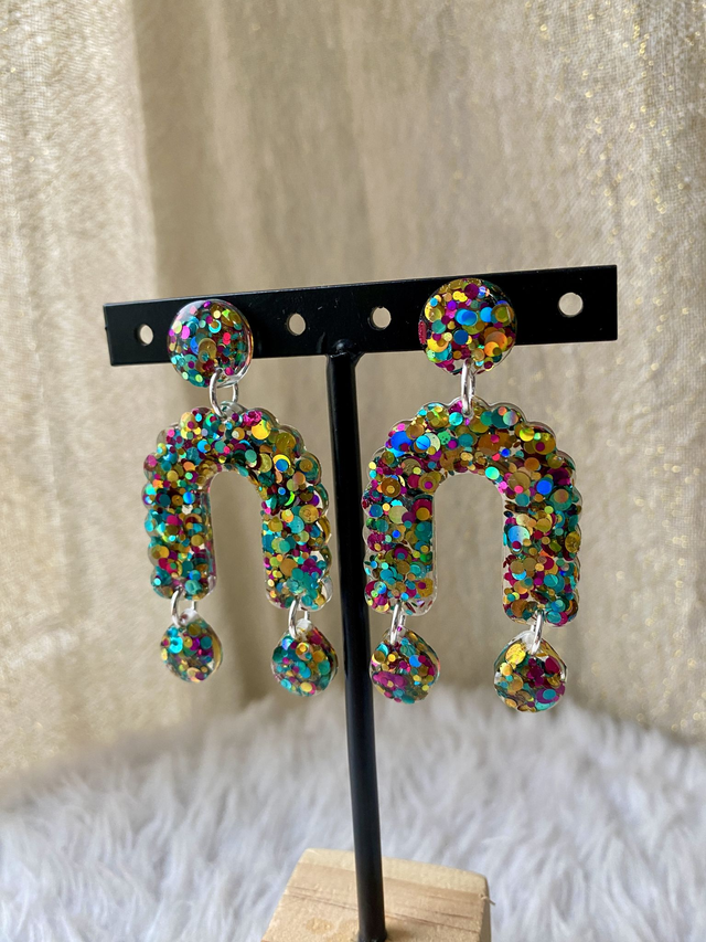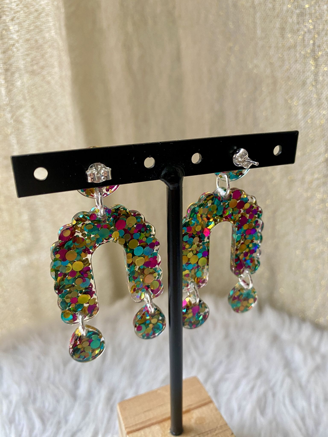 Boucles d'oreilles en argent 925 et incrustées de paillettes rainbow.