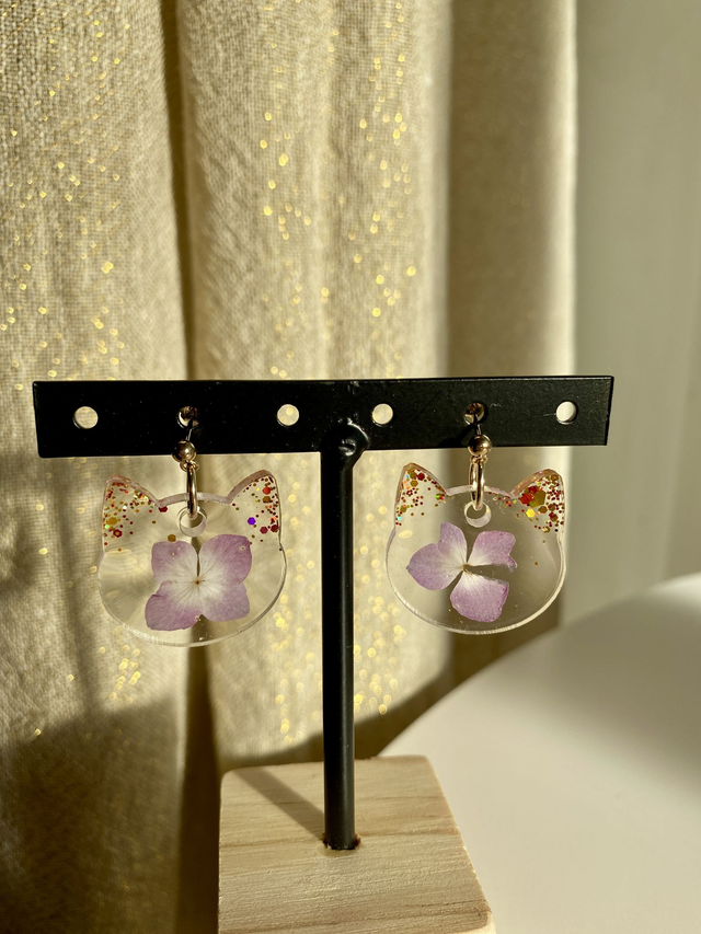 Boucles d'oreilles en gold filled (or laminé), incrustées d'hortensias et paillettes "chunky or".