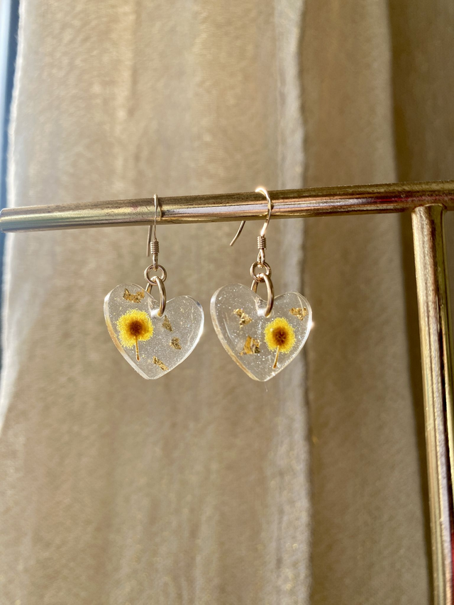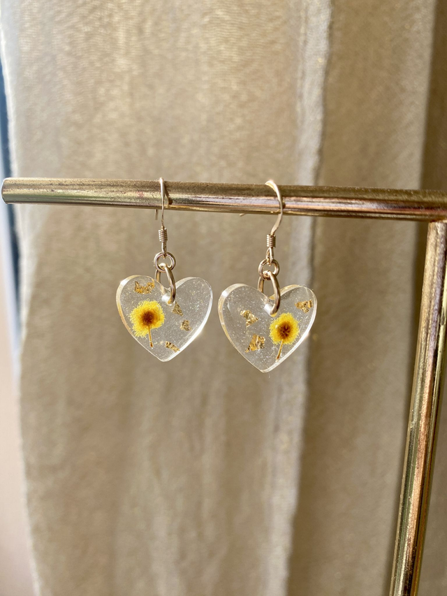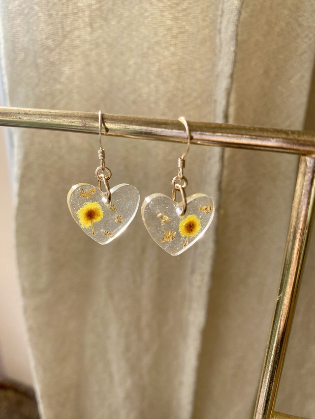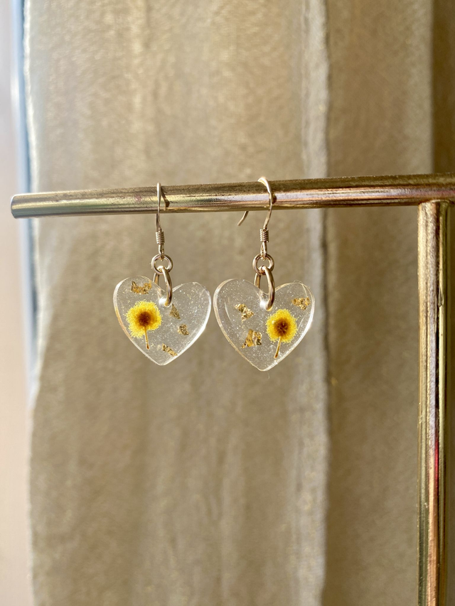 Boucles d'oreilles en gold filled (or laminé), incrustées de mimosa et flocons dorés, sur fond légèrement nacré.