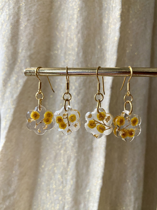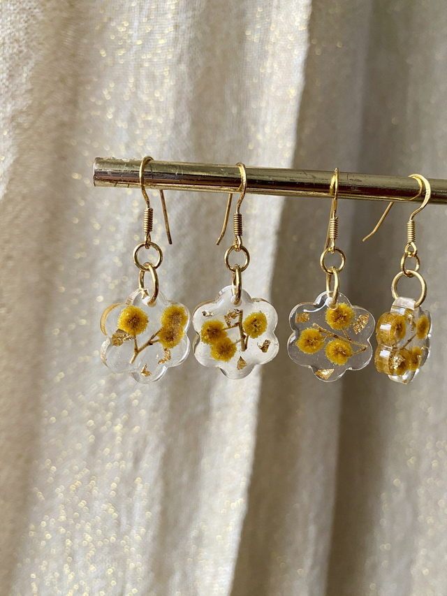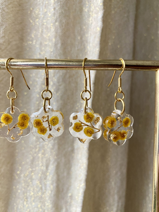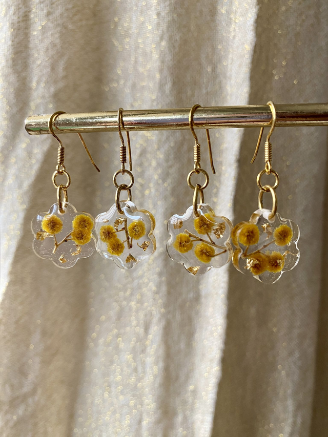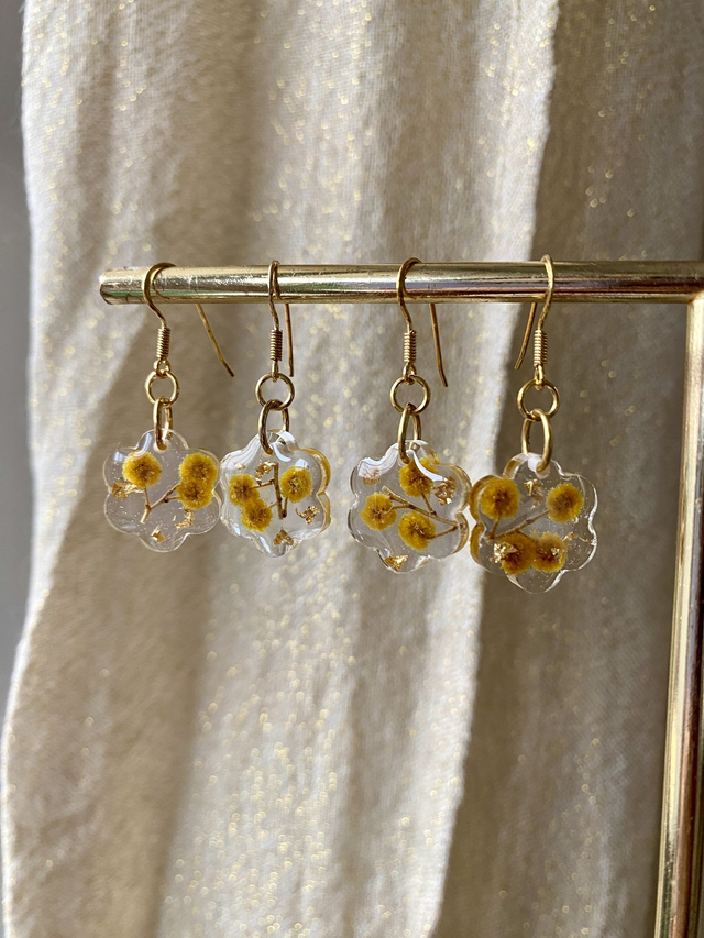Boucles d'oreilles en argent 925 doré à l'or fin, incrustées de mimosa et flocons dorés.