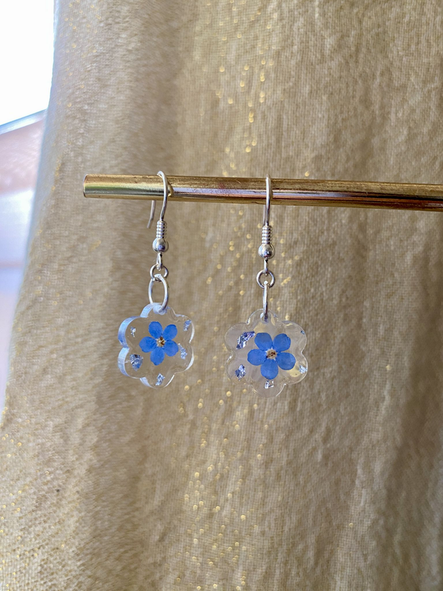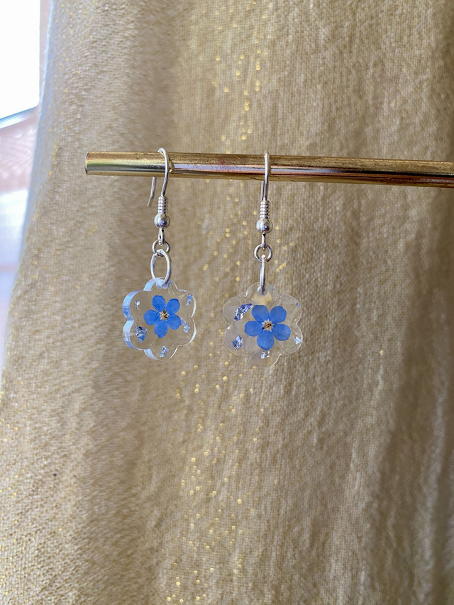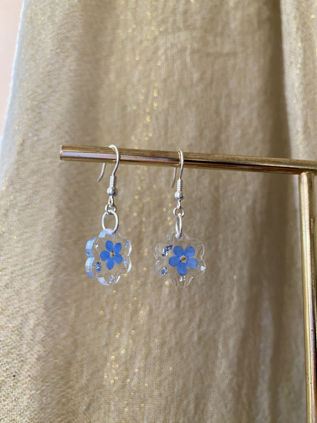 Boucles d'oreilles en argent 925, incrustées de myosotis.