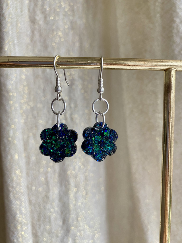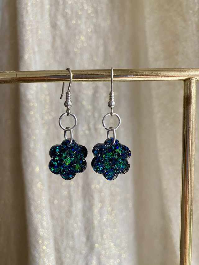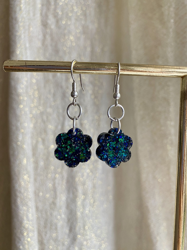 Boucles d'oreilles en argent 925, incrustées de paillettes nuit pourpre et irisé.