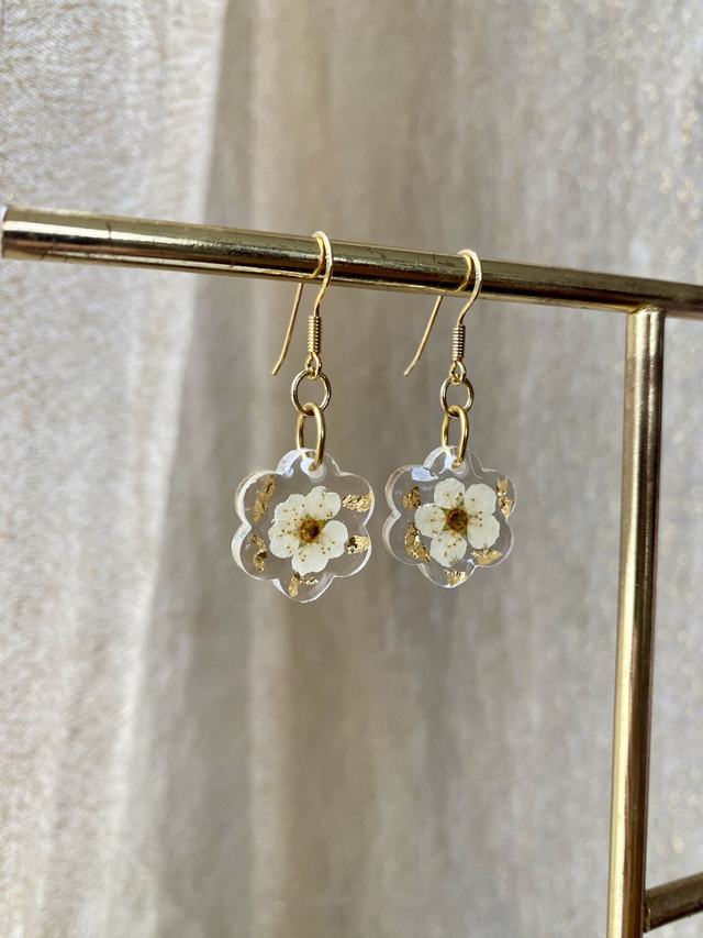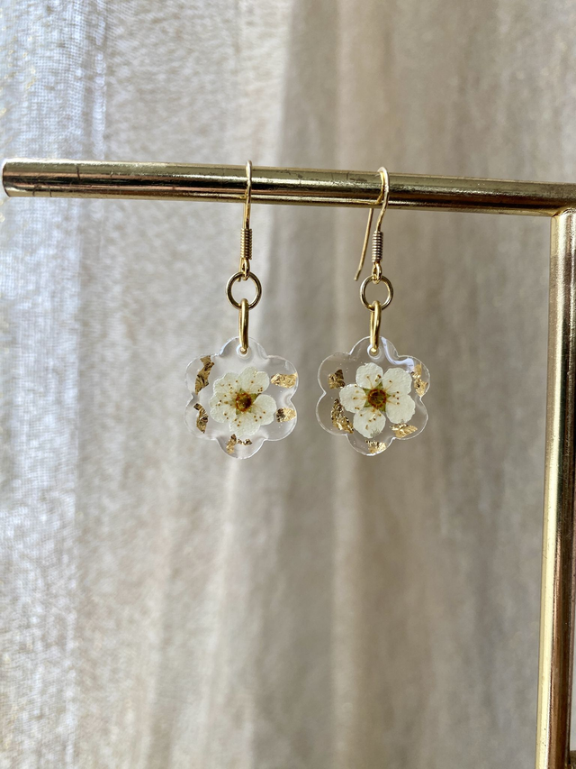 Boucles d'oreilles en gold filled, incrustées de fleurs de spirée et flocons dorés.