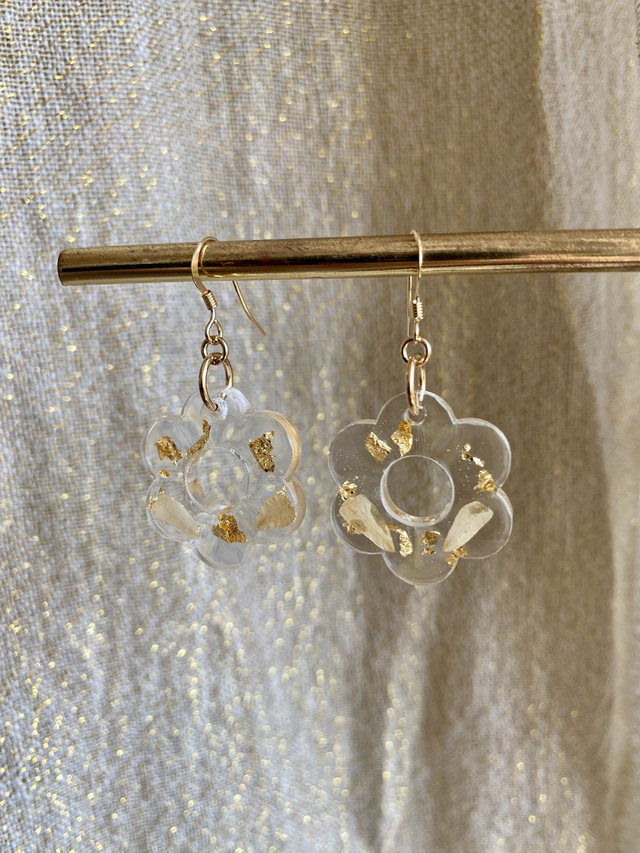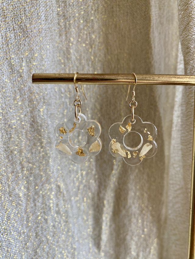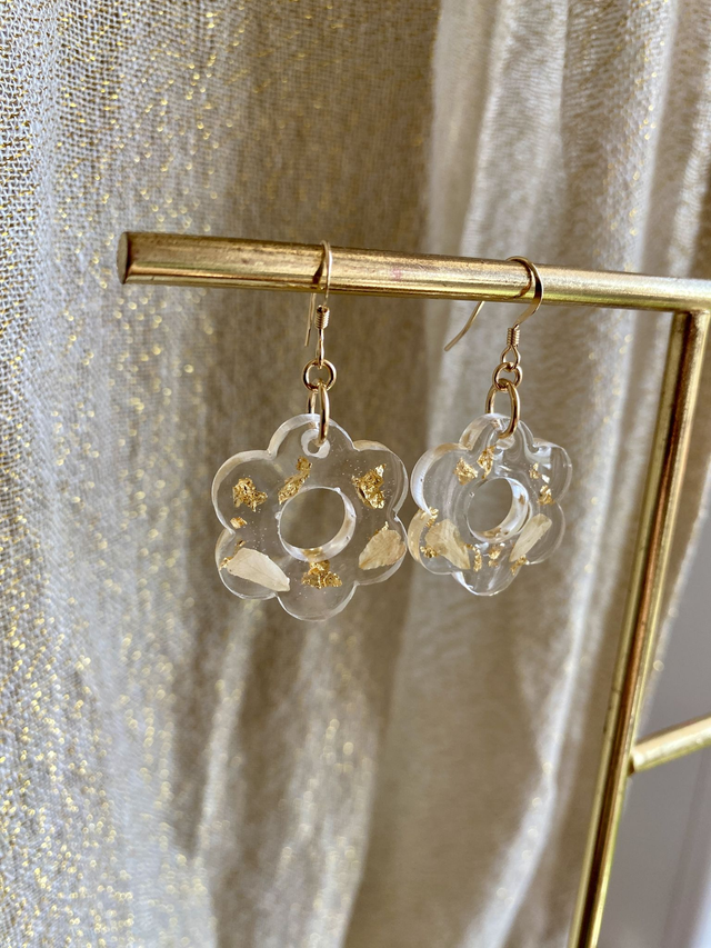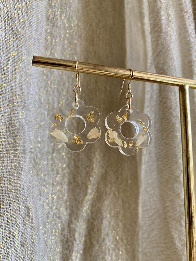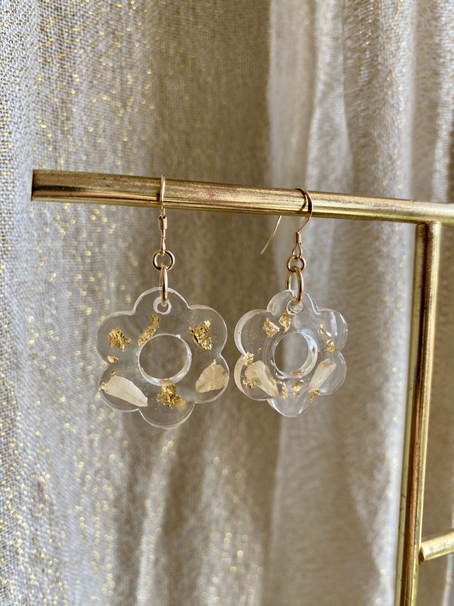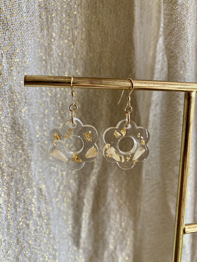 Boucles d'oreilles en gold filled, incrustées de pétales de rose et flocons d'or.