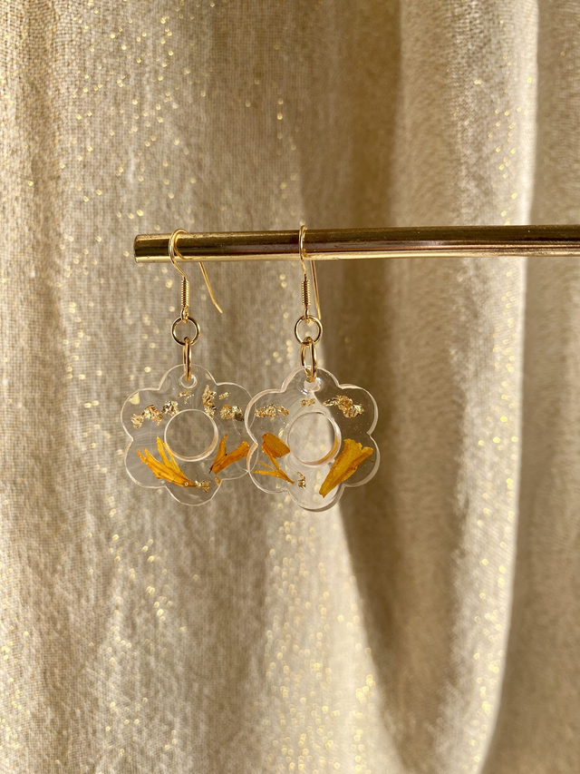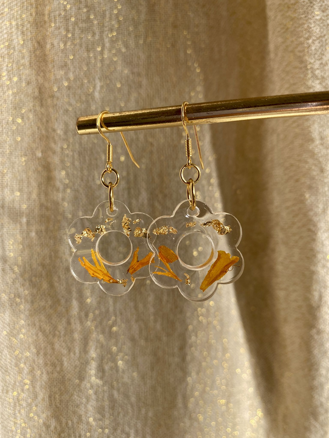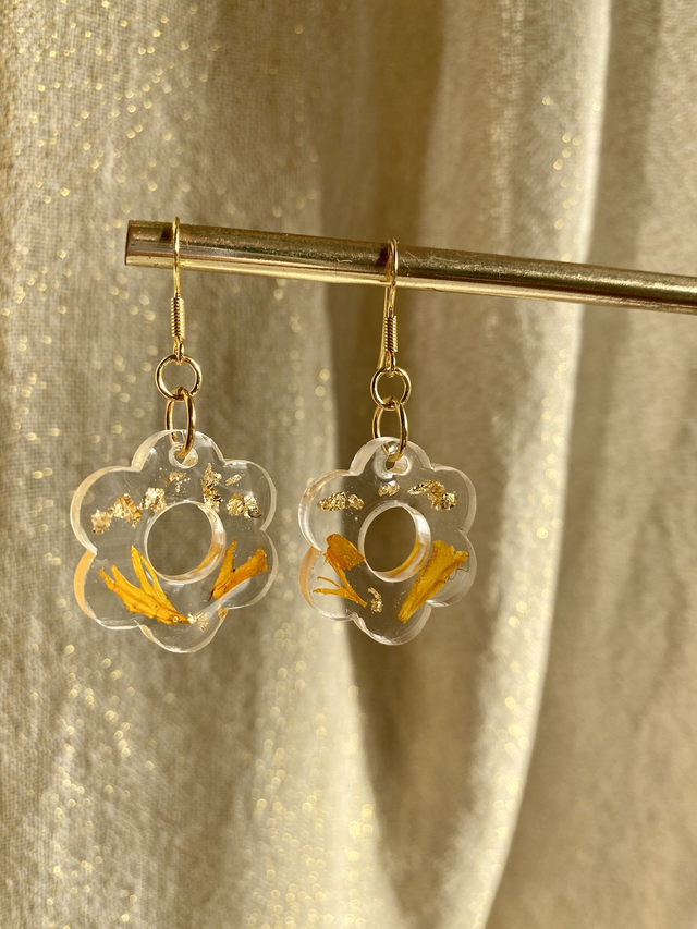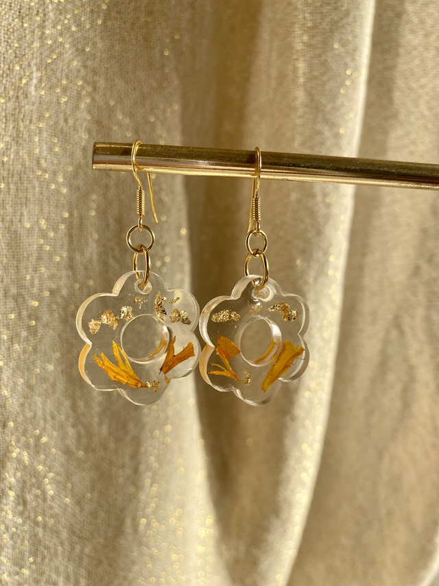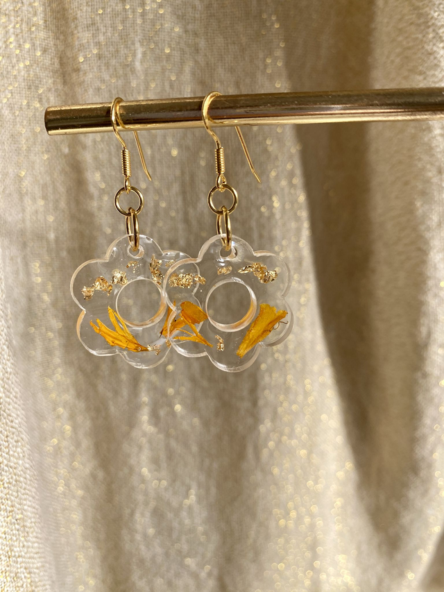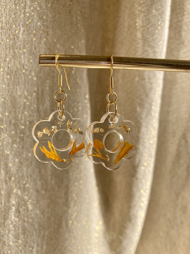 Boucles d'oreilles en argent 925 doré à l'or fin, incrustées de pétales de rose d'Inde et flocons dorés.
