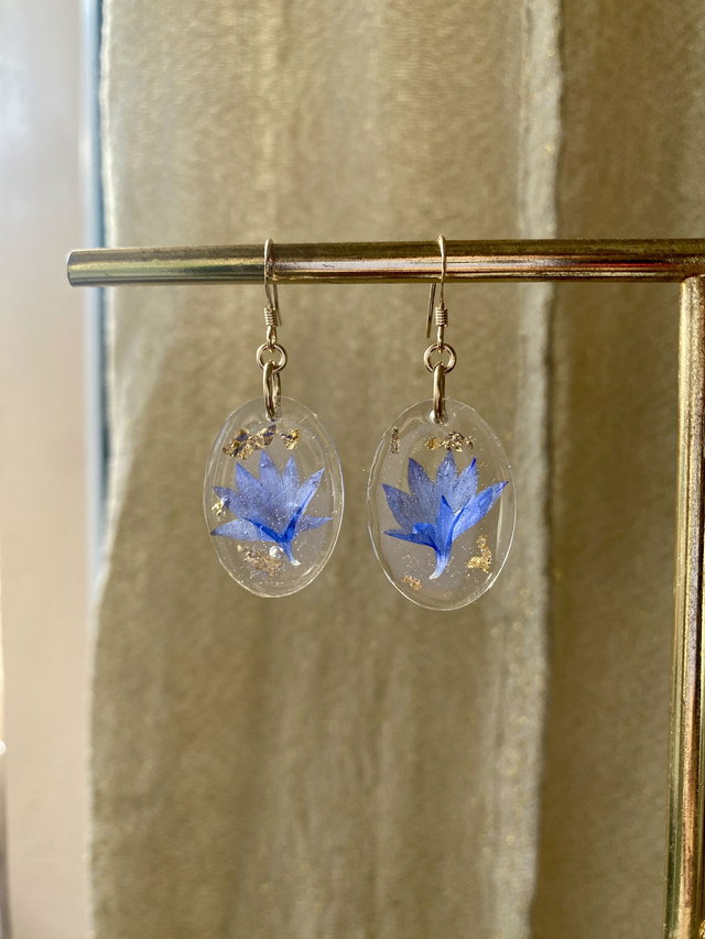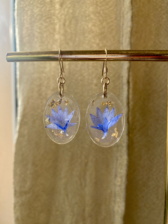 Boucles d'oreilles en gold filled (or laminé), incrustées de pétale de bleuet et flocons dorés.