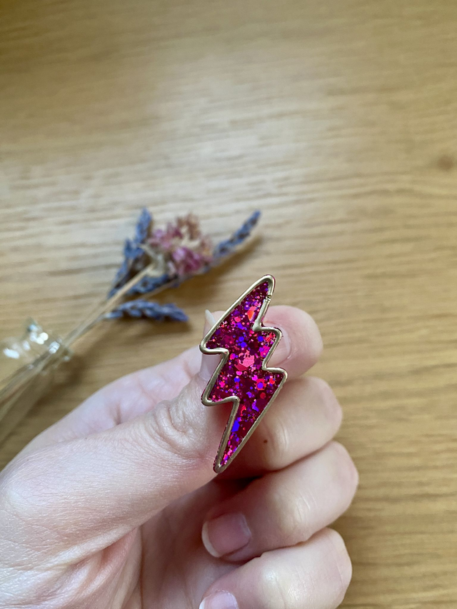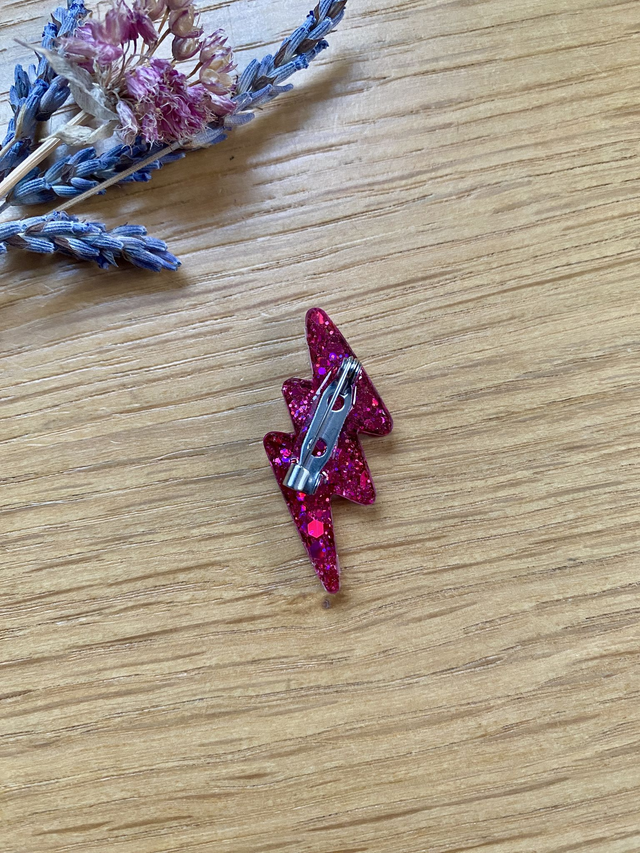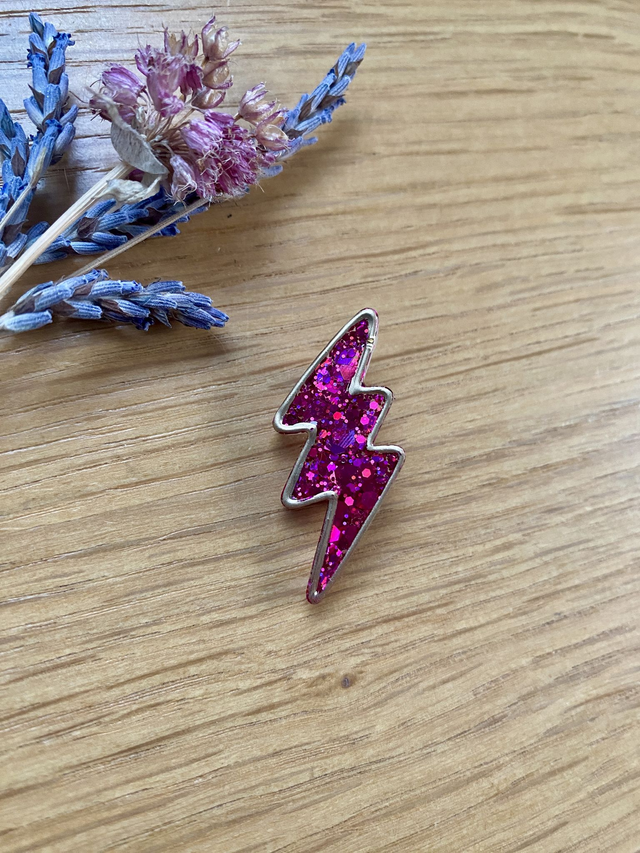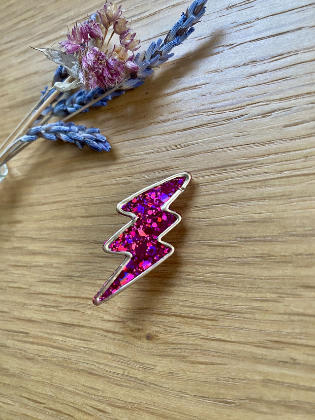 Broche forme éclair, incrustée de paillettes magenta et bords dorés.