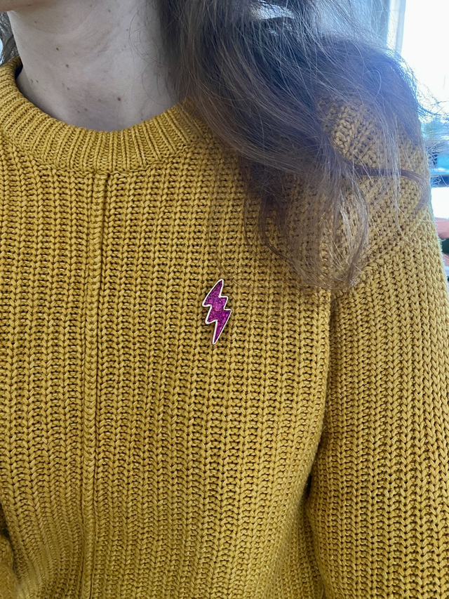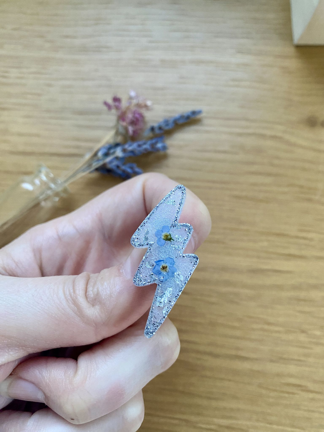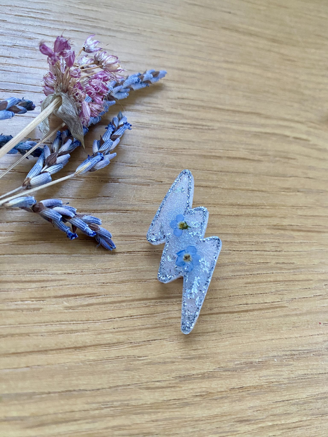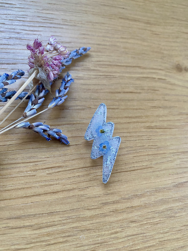 Broche forme éclair, incrustée de fleurs de myosotis et flocons argentés, bords argentés et fond nacré.