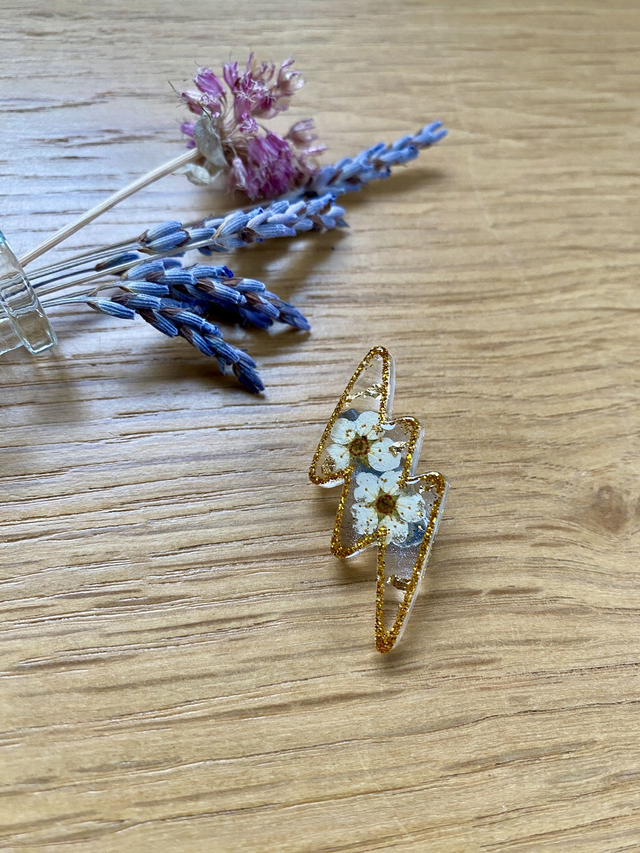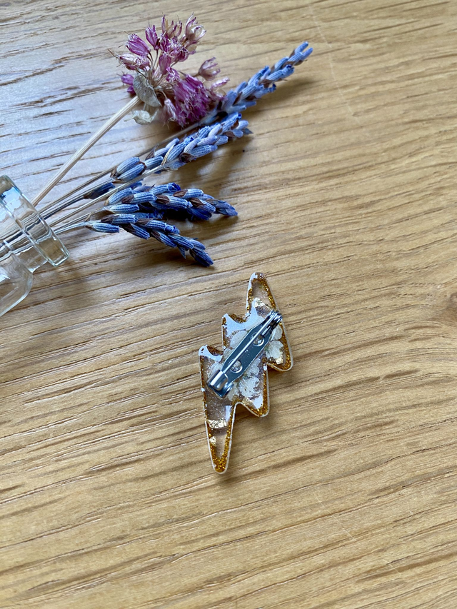Broche forme éclair, incrustée de fleurs de spirée et flocons dorés, bords dorés.