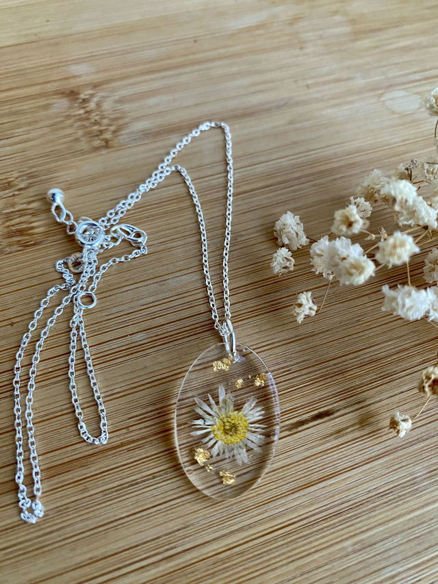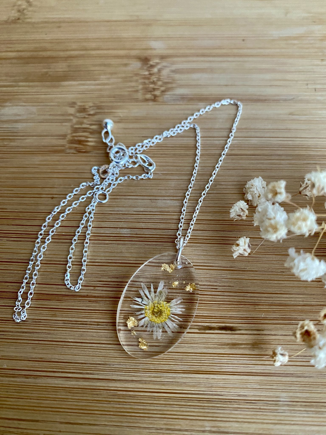Collier en argent 925, incrusté de pâquerette et flocons dorés.