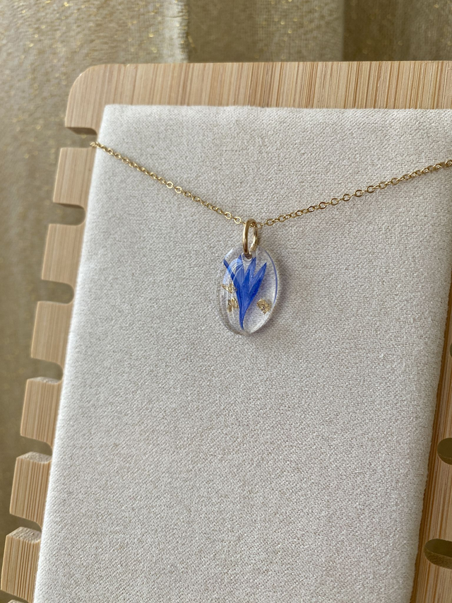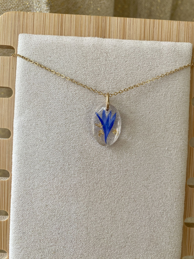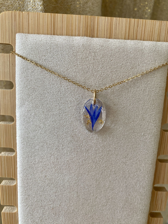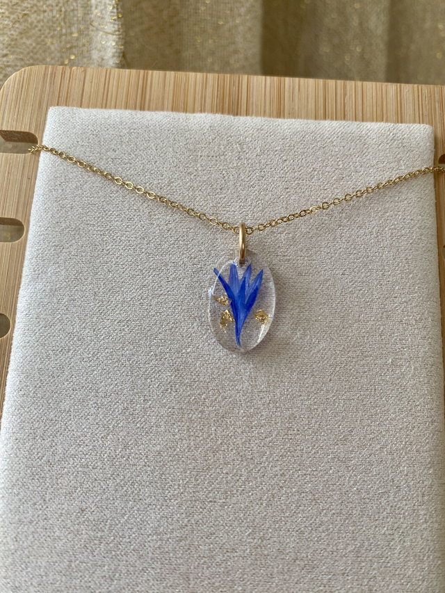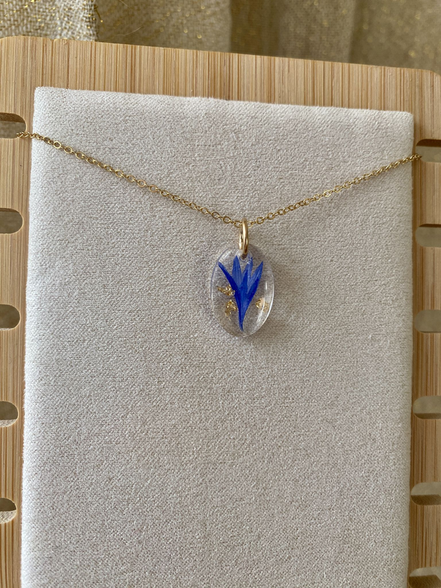 Collier en gold filled (or laminé), incrusté de pétale de bleuet et flocons dorés.