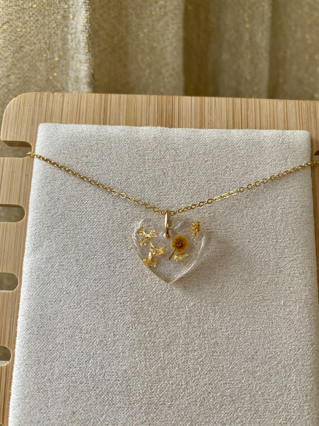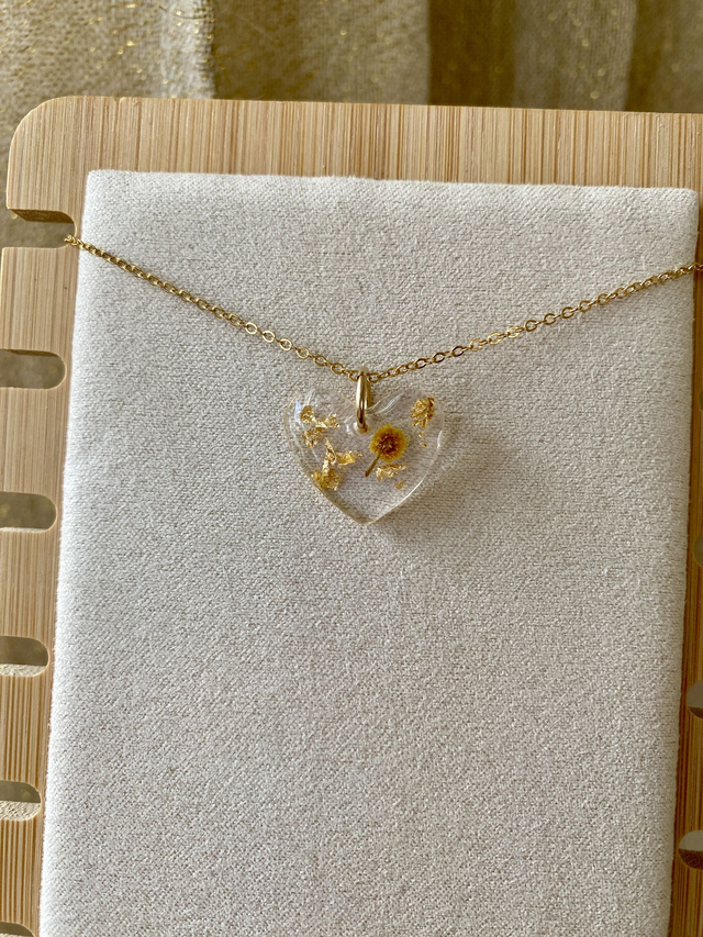 Collier en gold filled (or laminé), incrusté de mimosa et flocons dorés.