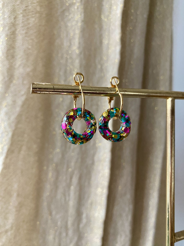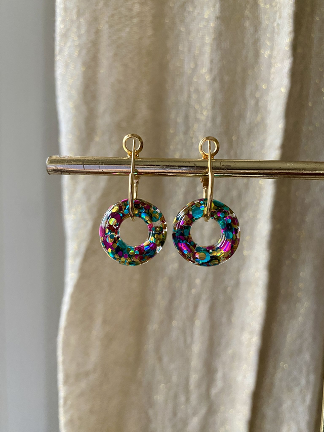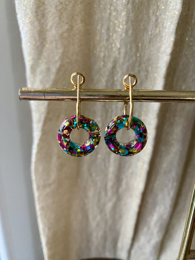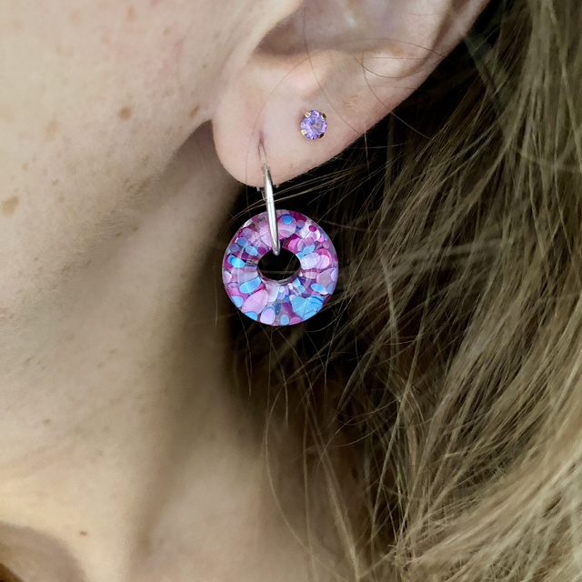 Dimensions: environ 3 cm de longueur avec les créoles ; environ 2 cm de diamètre le donut.