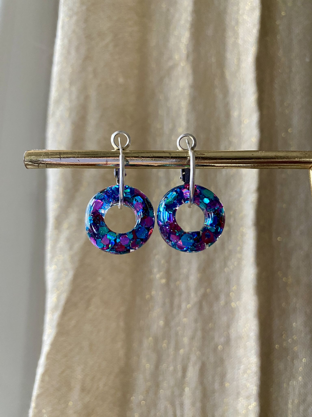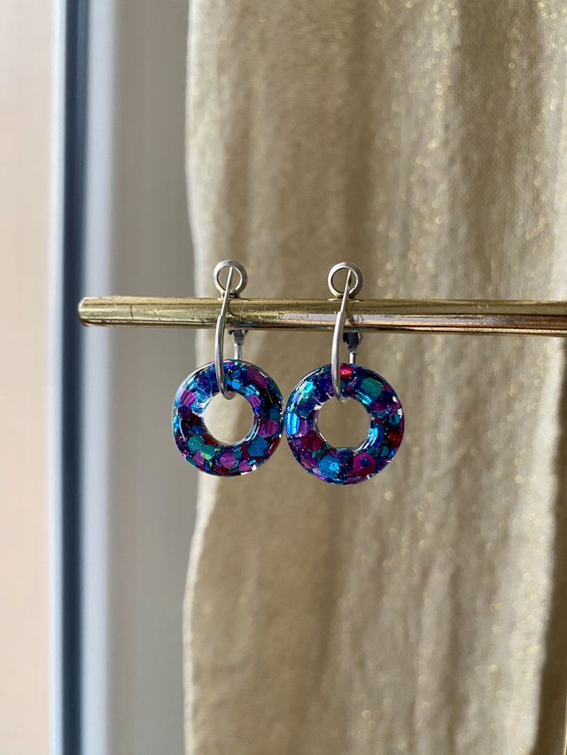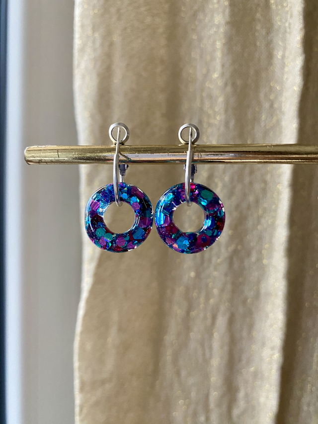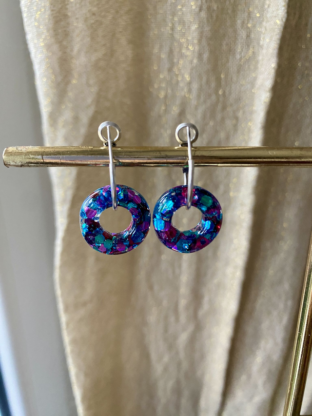 Dimensions: environ 3 cm de longueur avec les créoles ; environ 2 cm de diamètre le donut.