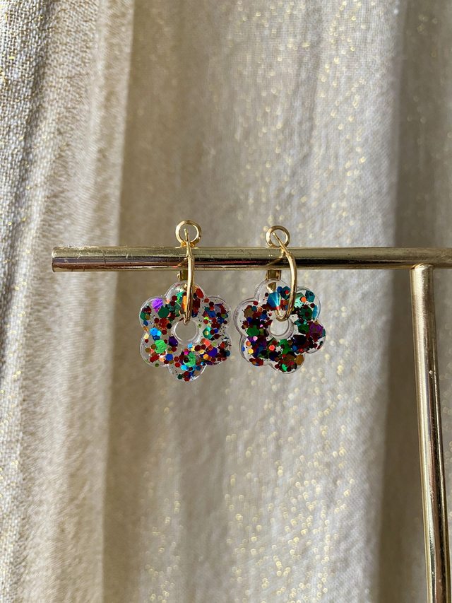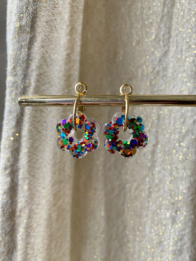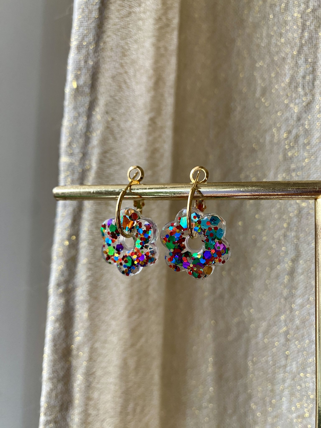 Dimensions: environ 3 cm de longueur avec les créoles ; environ 2 cm de diamètre la fleur.