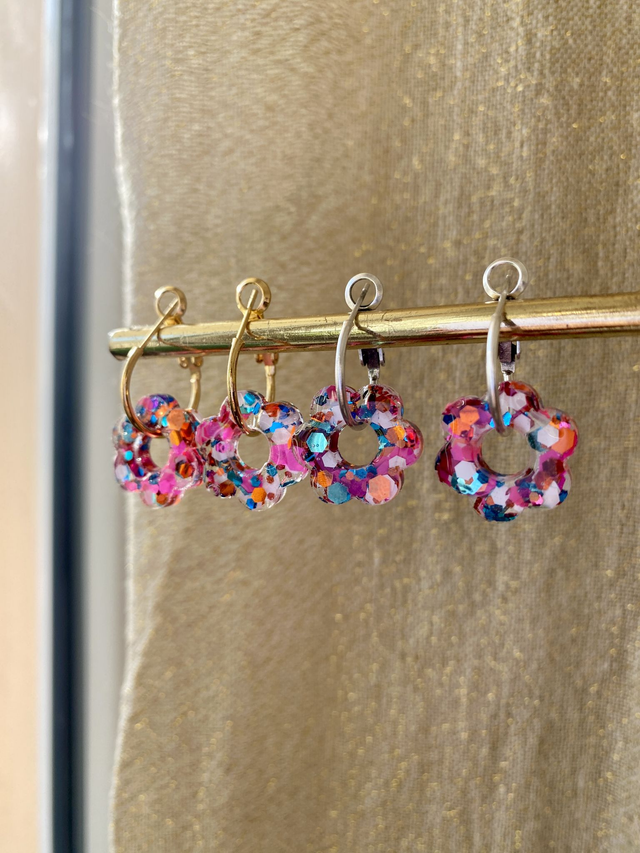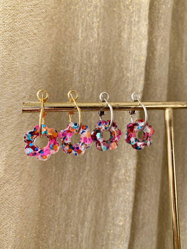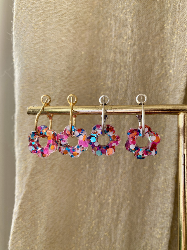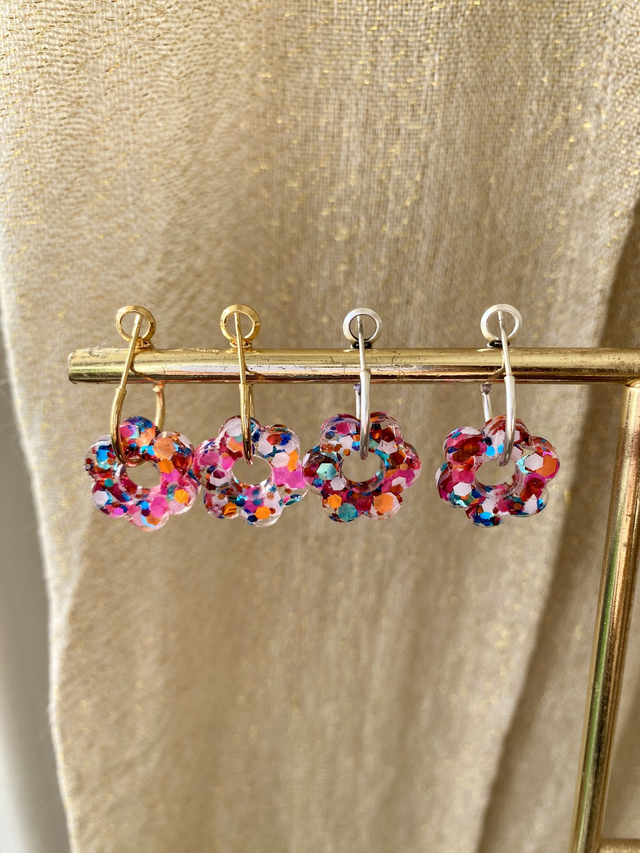 Dimensions: environ 2,5 cm de longueur avec les créoles ; environ 1,5 cm de diamètre la fleur.