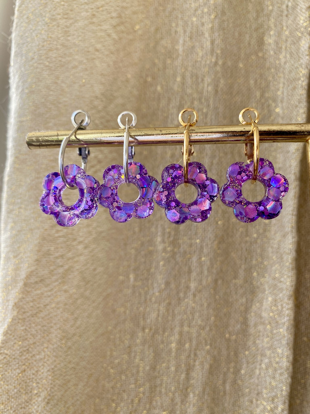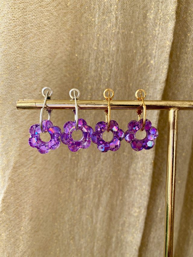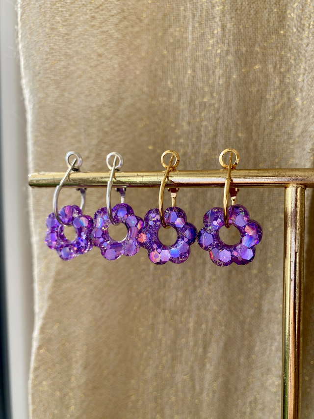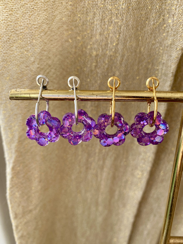 Dimensions: environ 2,5 cm de longueur avec les créoles ; environ 1,5 cm de diamètre la fleur.
