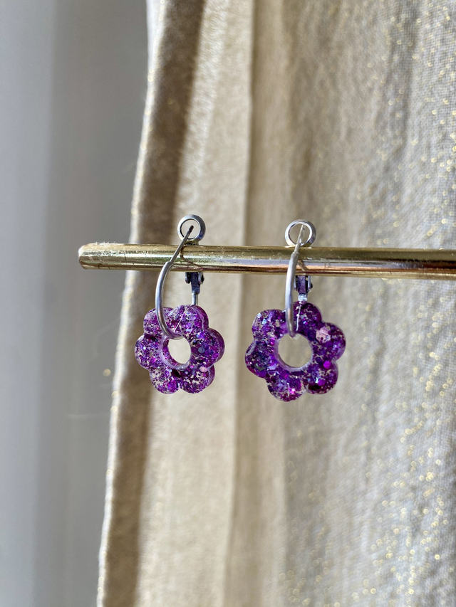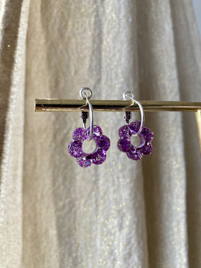 Dimensions: environ 2,5 cm de longueur avec les créoles ; environ 1,5 cm de diamètre la fleur.