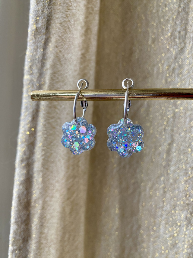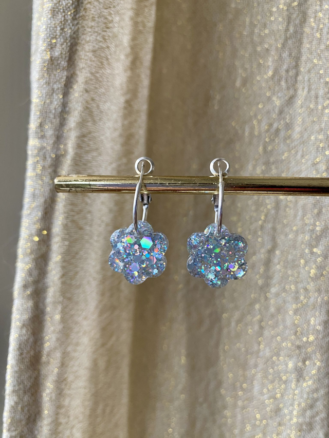 Dimensions: environ 3 cm de longueur avec les créoles ; environ 1,5 cm de diamètre la fleur.