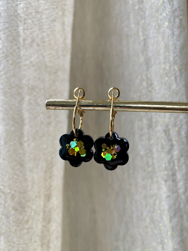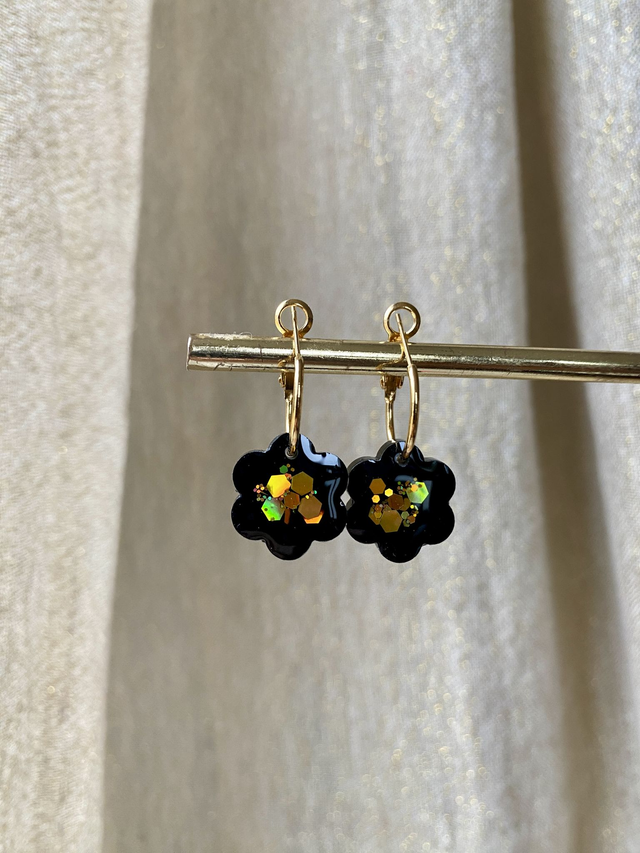 Dimensions: environ 3 cm de longueur avec les créoles ; environ 1,5 cm de diamètre la fleur.