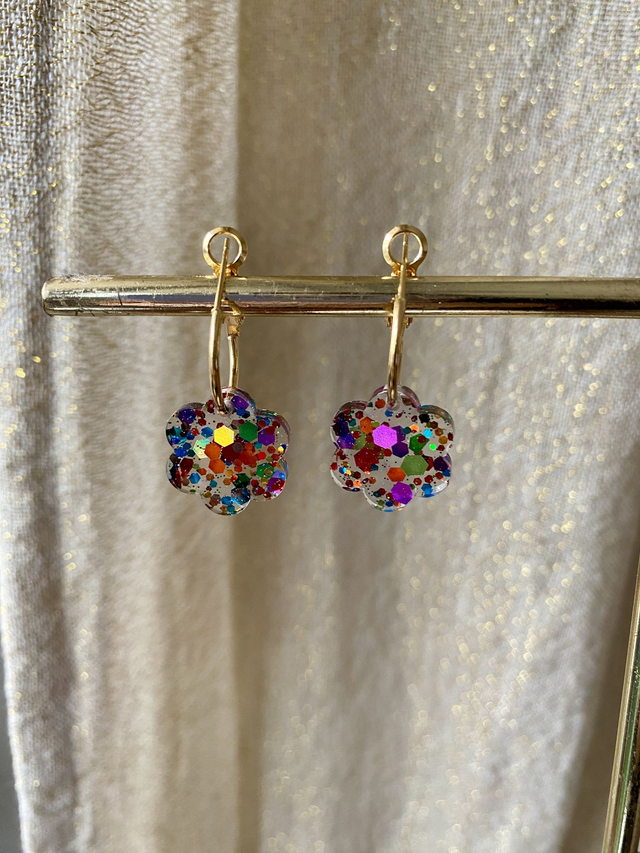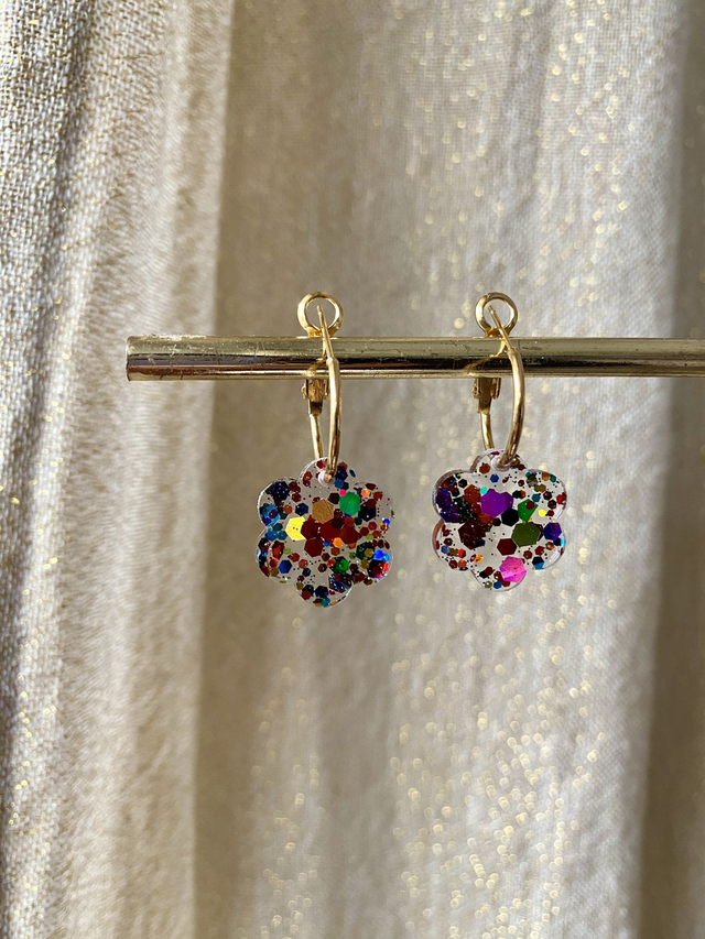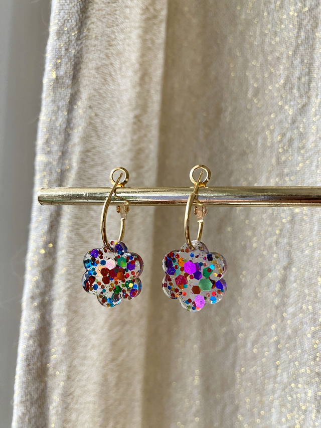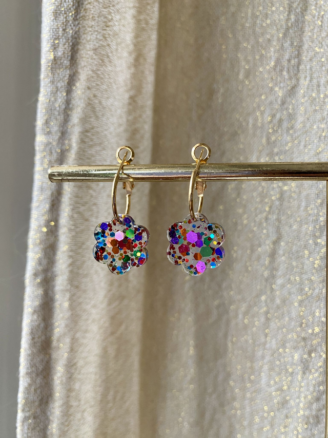 Dimensions: environ 3 cm de longueur avec les créoles ; environ 1,5 cm de diamètre la fleur.