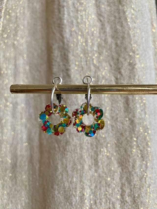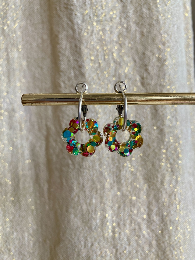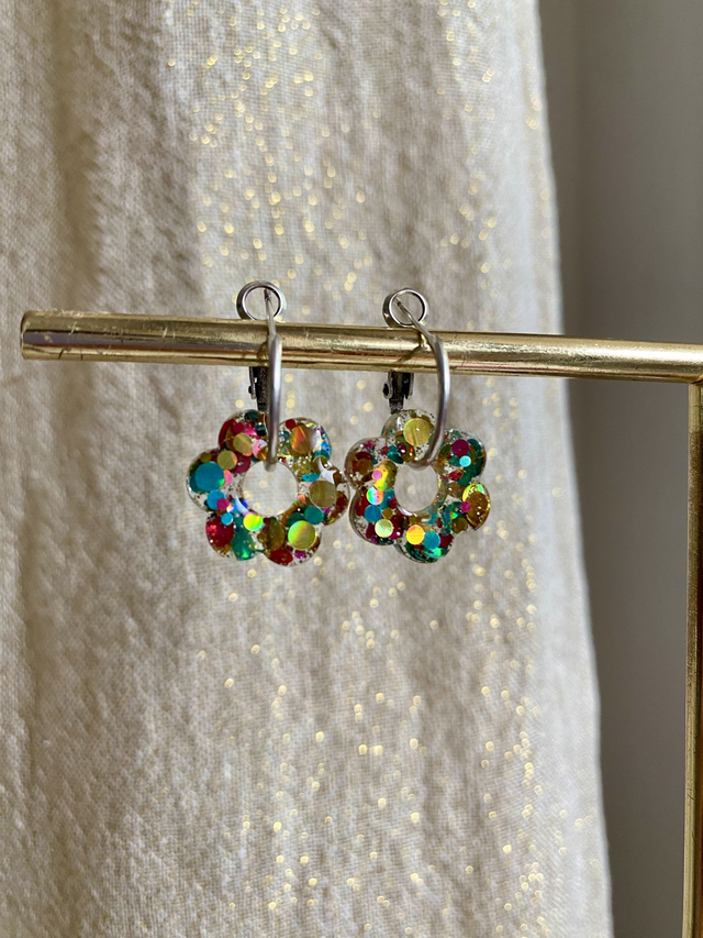 Dimensions: environ 2,5 cm de longueur avec les créoles ; environ 1,5 cm de diamètre la fleur.