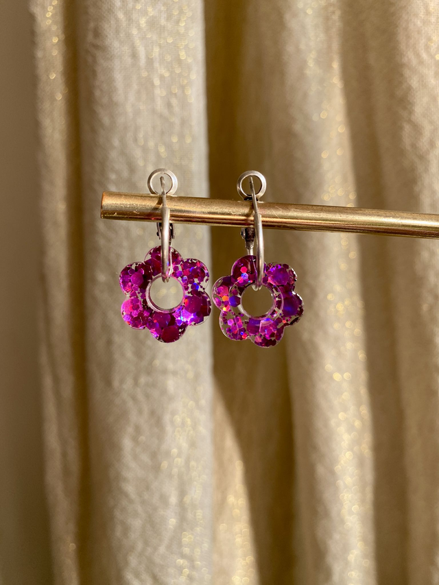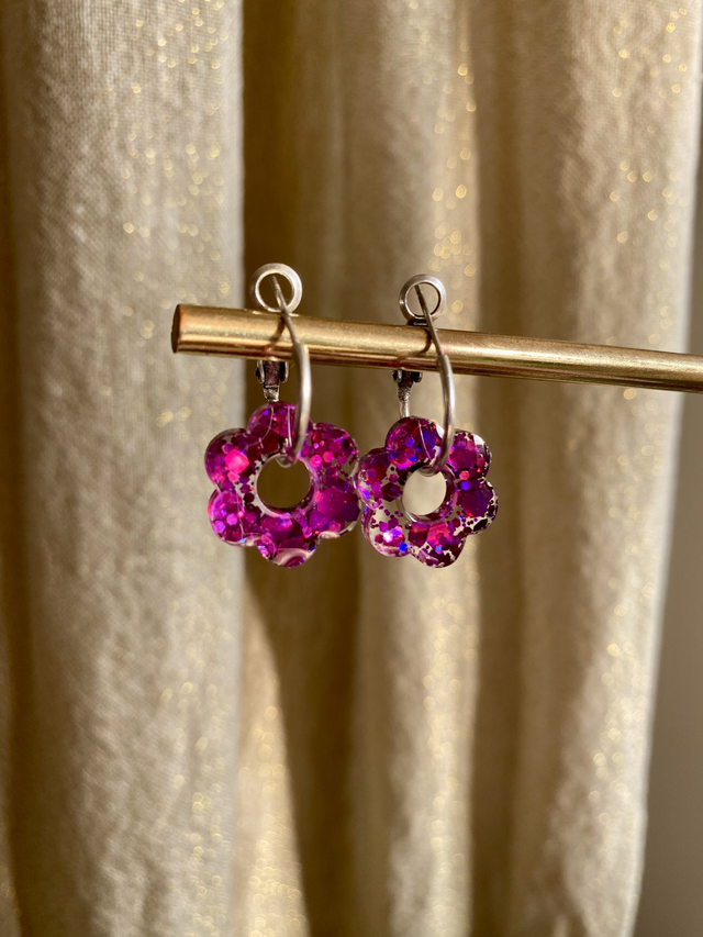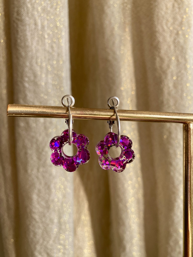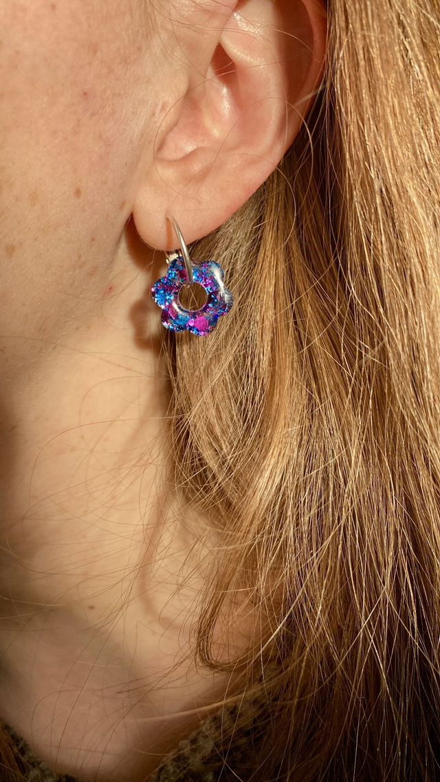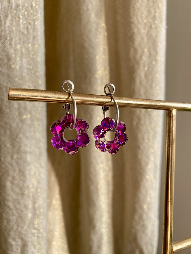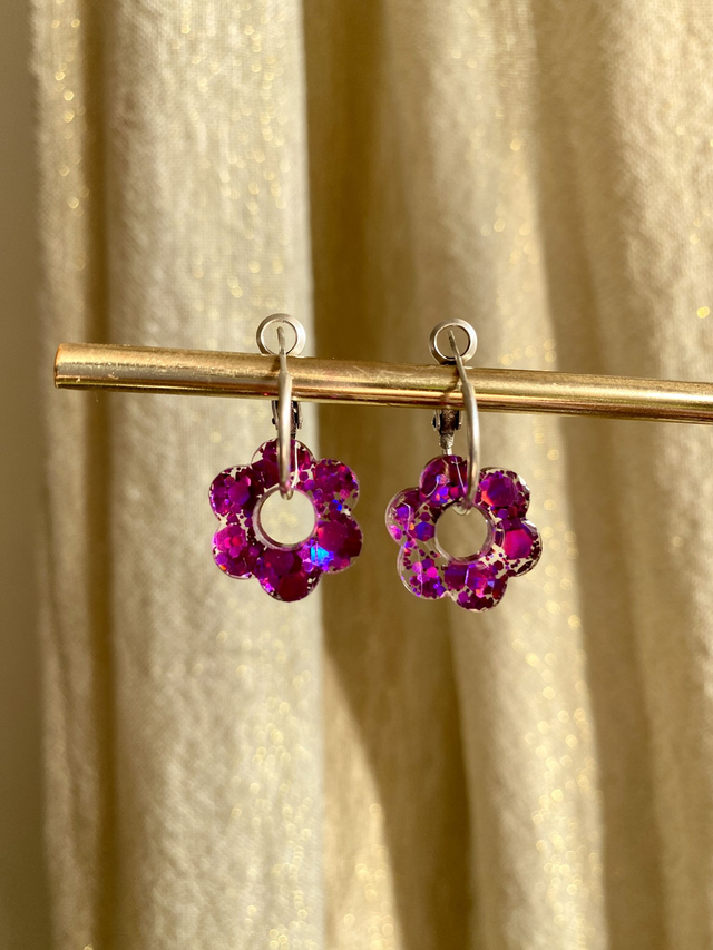 Dimensions: environ 2,5 cm de longueur avec les créoles ; environ 1,5 cm de diamètre la fleur.