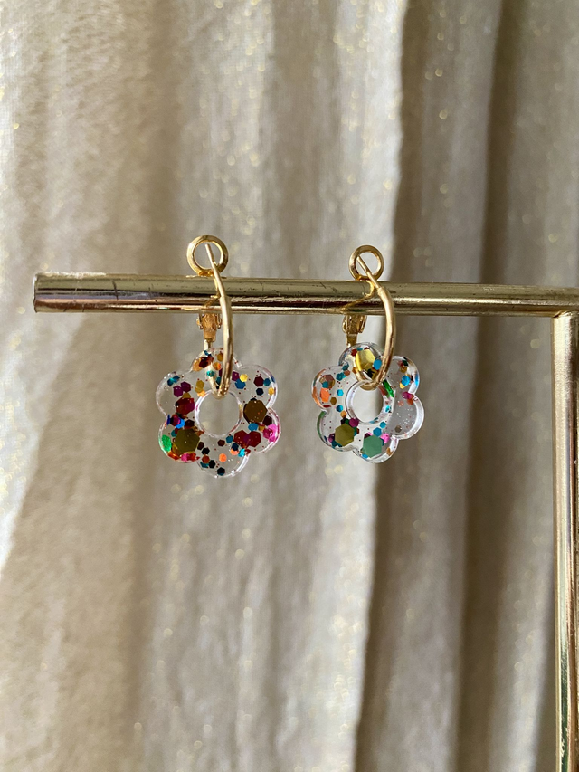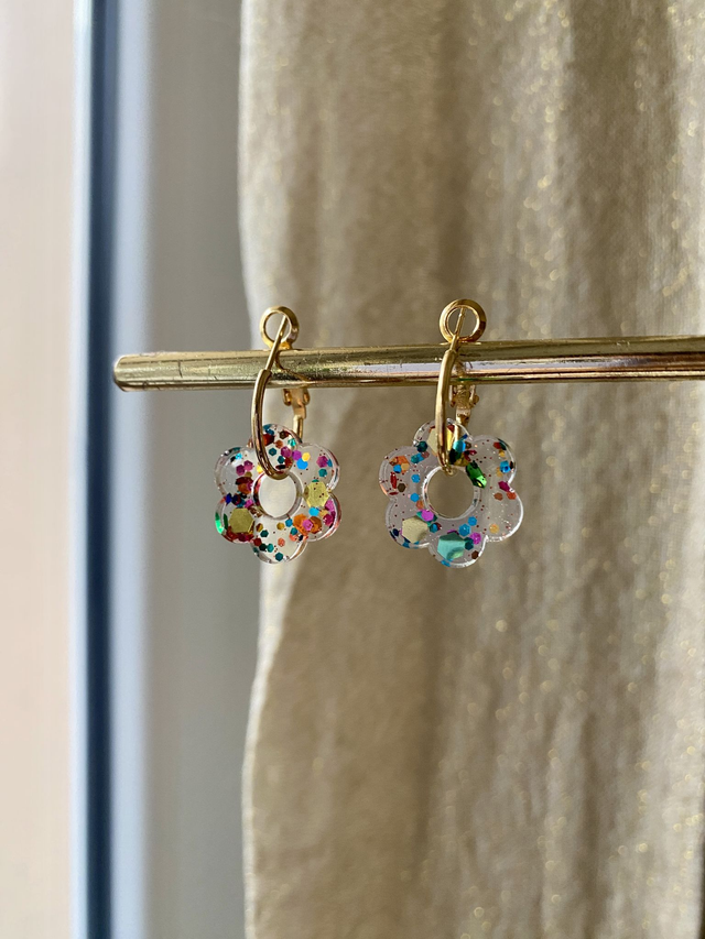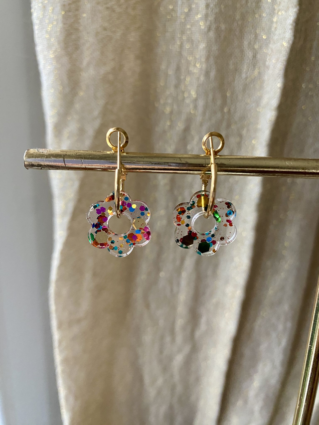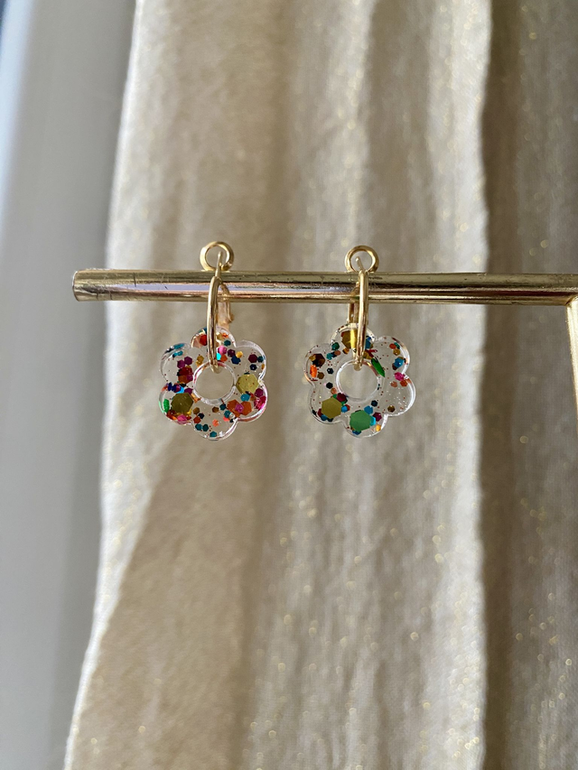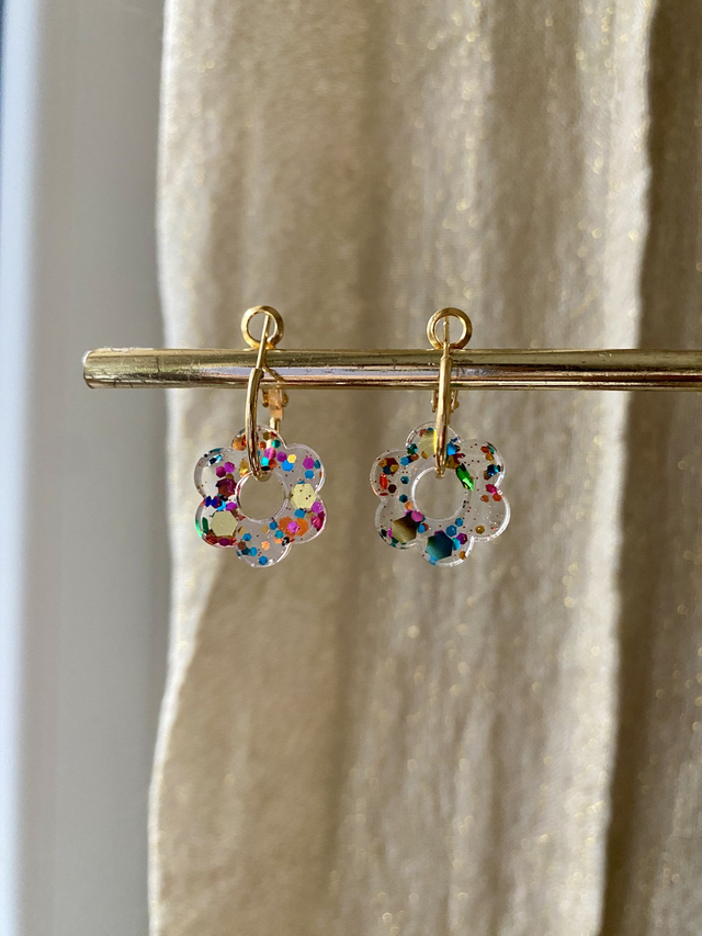Dimensions: environ 2,5 cm de longueur avec les créoles ; environ 1,5 cm de diamètre la fleur.