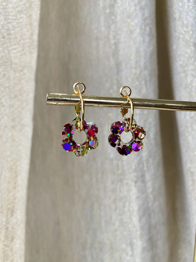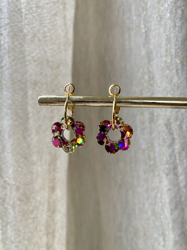 Dimensions: environ 2,5 cm de longueur avec les créoles ; environ 1,5 cm de diamètre la fleur.