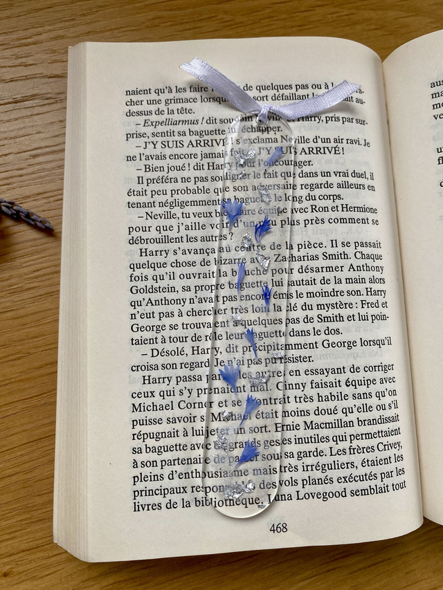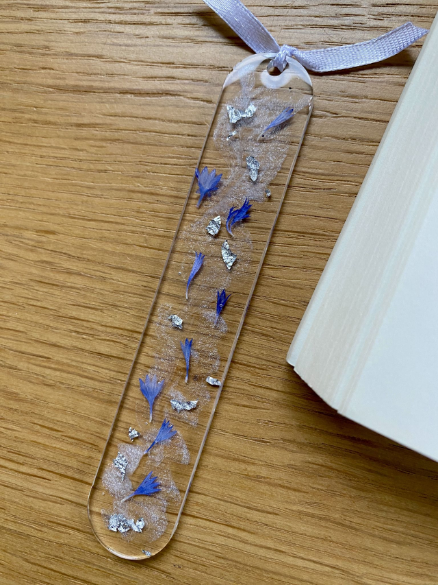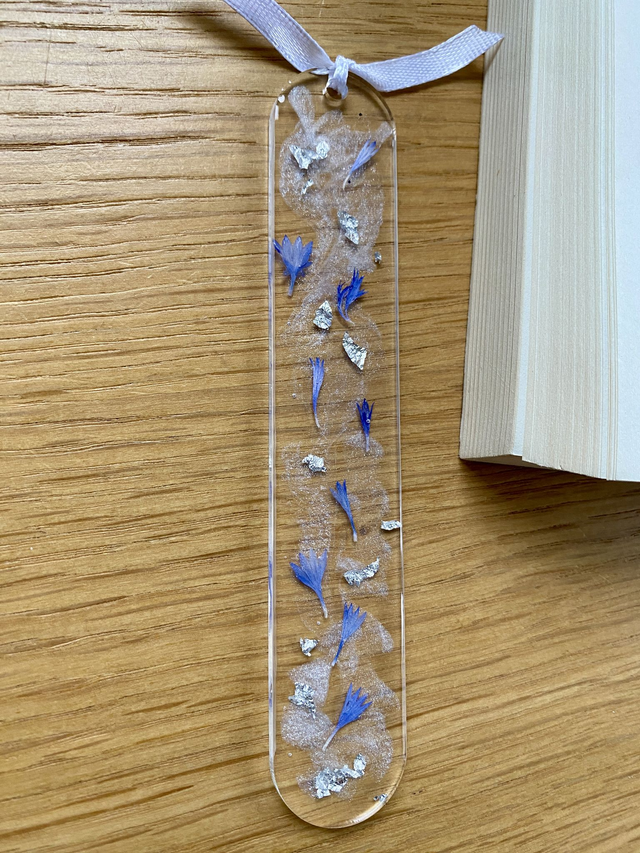 Marque page incrusté de pétales de bleuet et flocons argentés sur fond nacré.