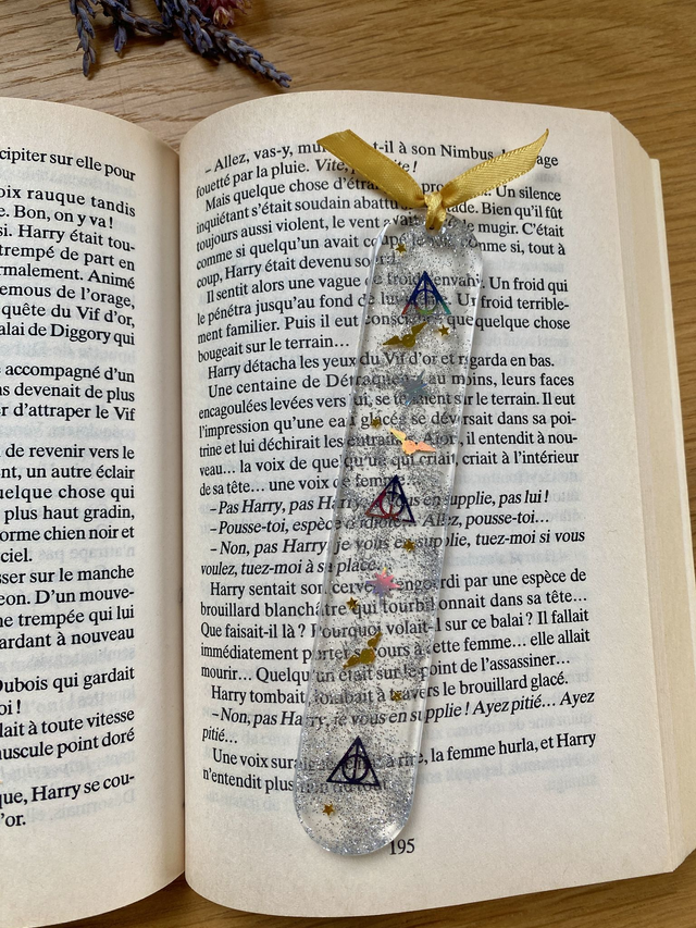 Marque page magique, inspiré du célèbre sorcier, motifs reliques et vif d'or.