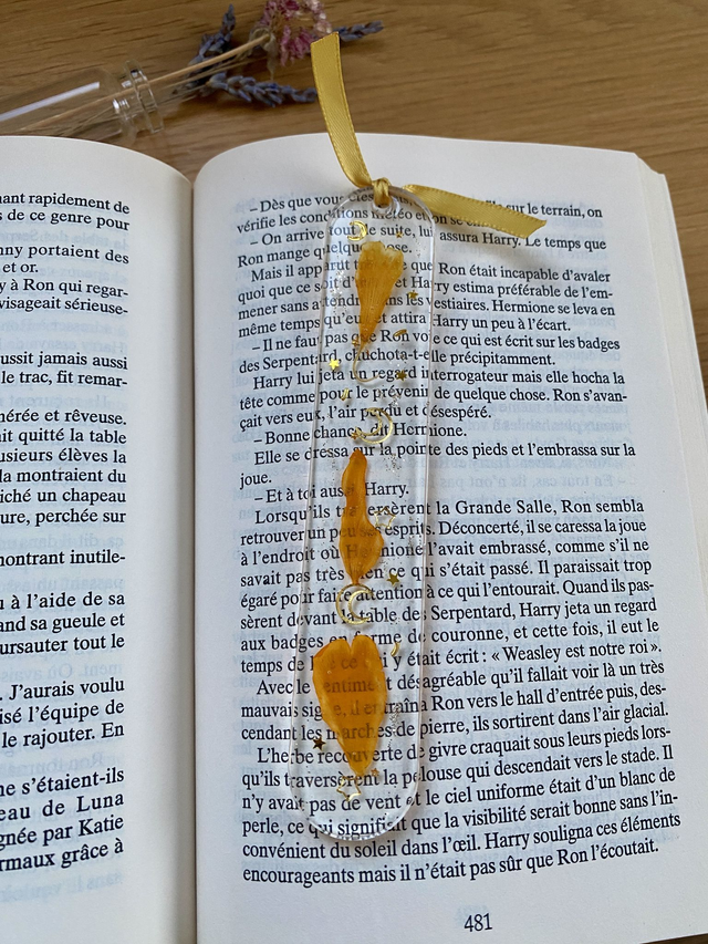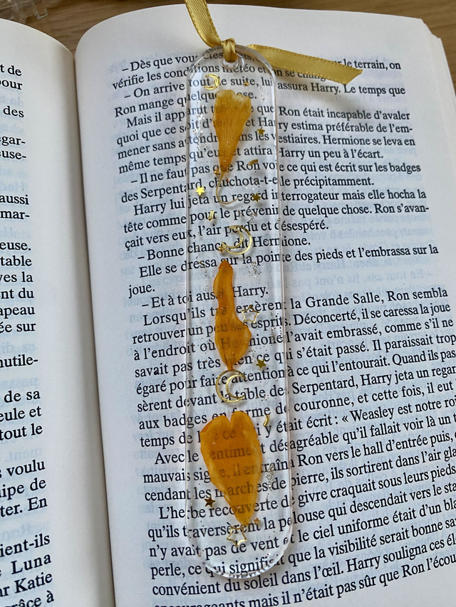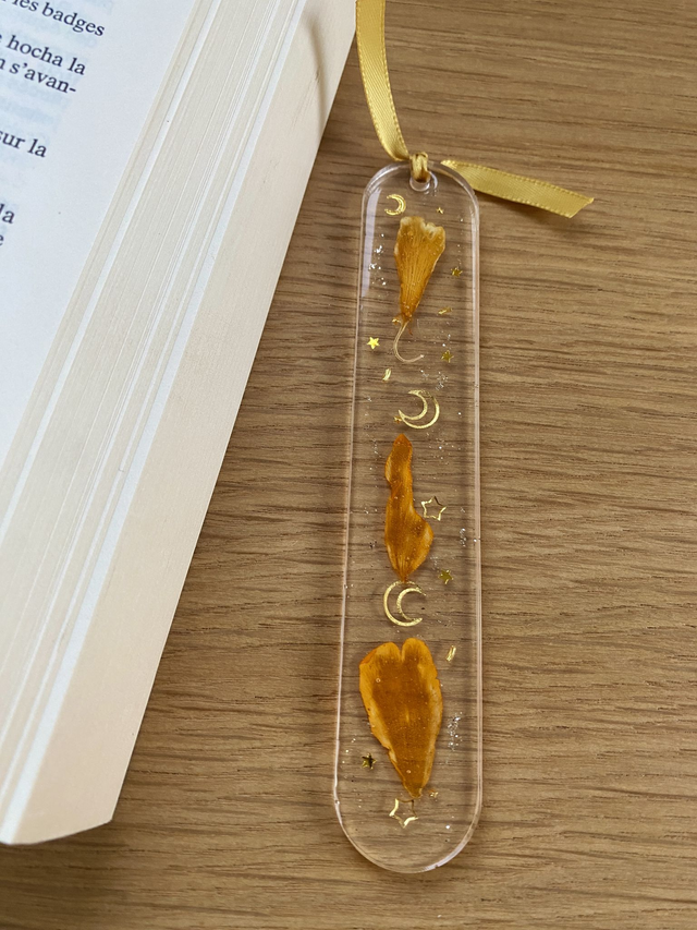 Marque page incrusté de pétales de rose d'Inde, éléments célestes et paillettes dorées.