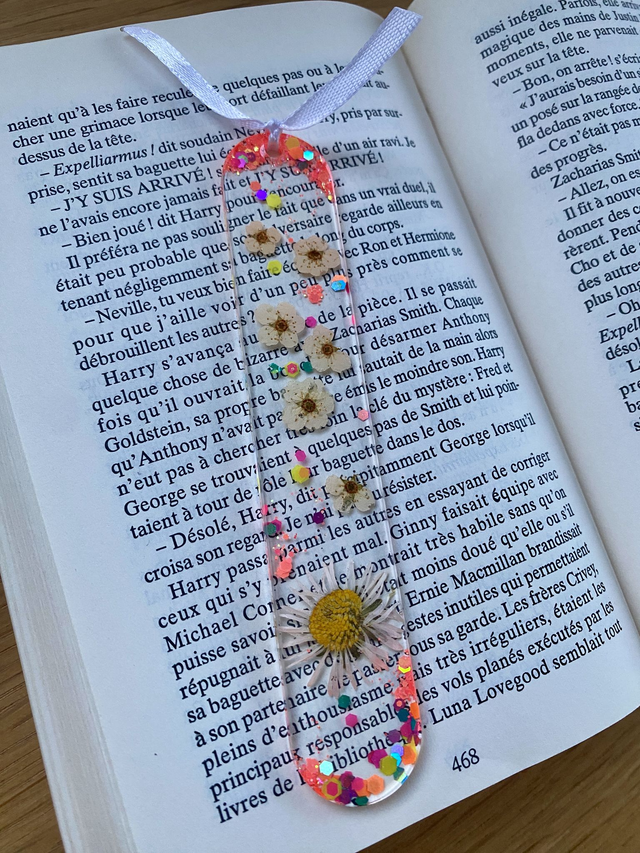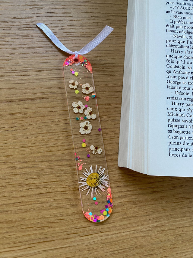Marque page incrusté de fleurs de spirée, pâquerette et paillettes corail et pinata.