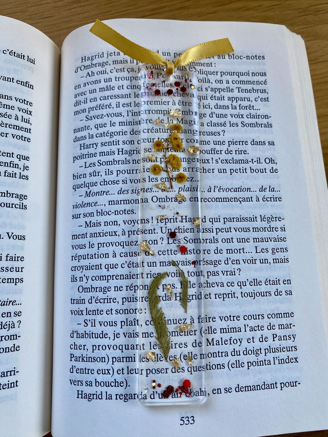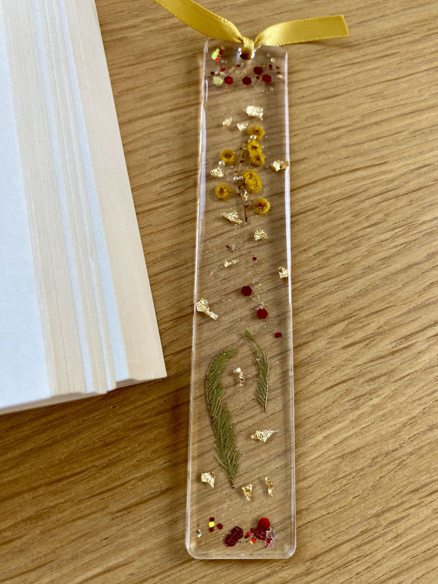 Marque page incrusté de mimosa, paillettes caramel et flocons dorés.