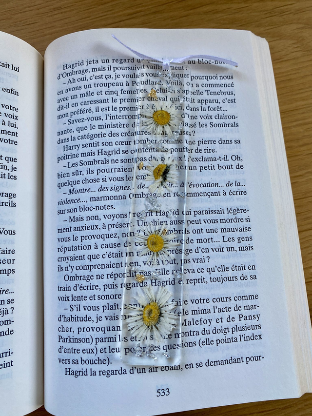 Marque page incrusté de pâquerettes et flocons dorés et argentés.