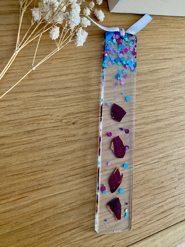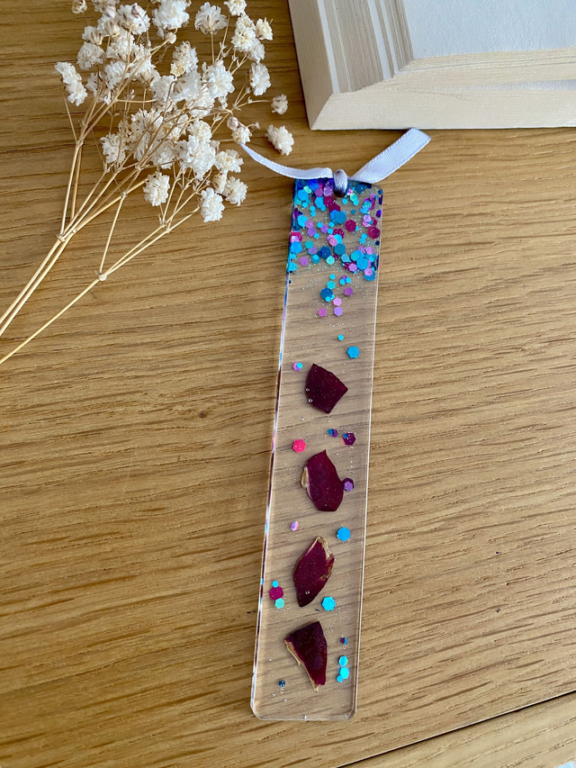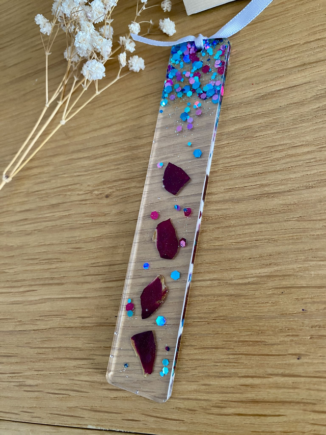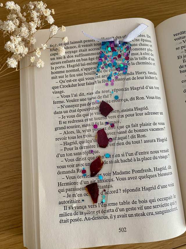 Marque page incrusté de pétales de rose rouge et paillettes raspberry.