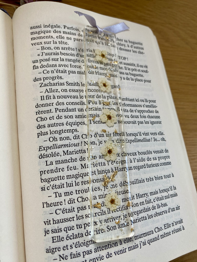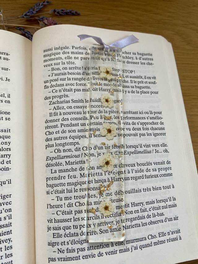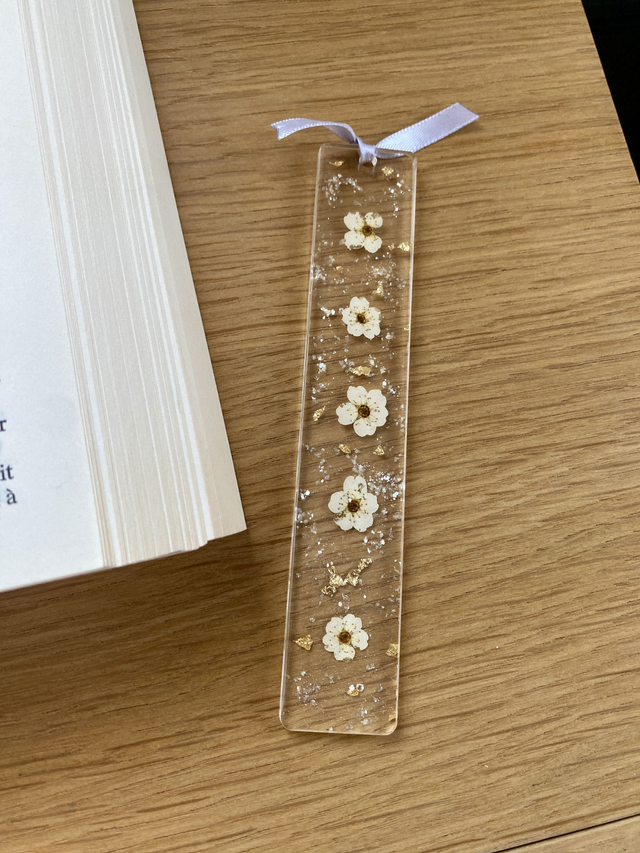 Marque page incrusté de fleurs de spirée, paillettes pastel jaunes et flocons dorés.