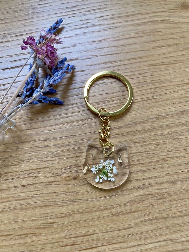 Porte clé chat, incrusté de fleur de carotte sauvage et flocons dorés.
