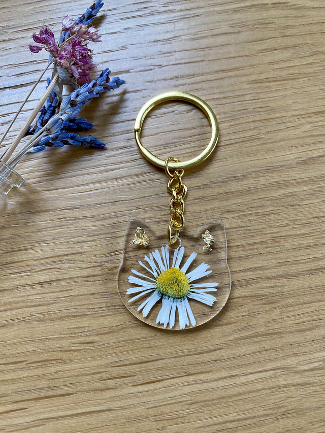 Porte clé chat, incrusté de pâquerette et flocons dorés.