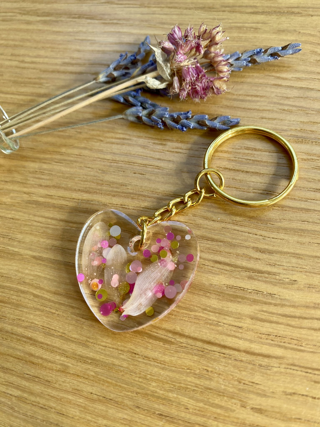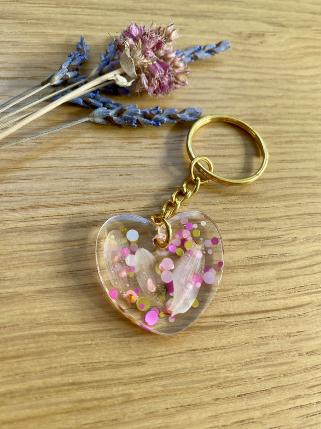 Porte clé en forme de coeur, incrusté de pétales blancs et confettis roses.