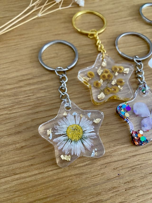 Porte clé en forme d'étoile, incrusté de pâquerette et flocons dorés.