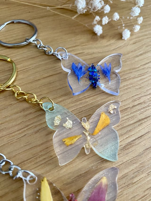 Porte clé en forme de papillon, incrusté de pétales de bleuet et flocons argentés.