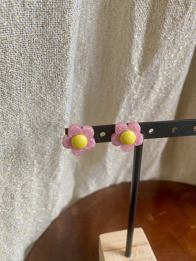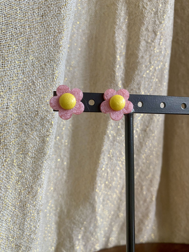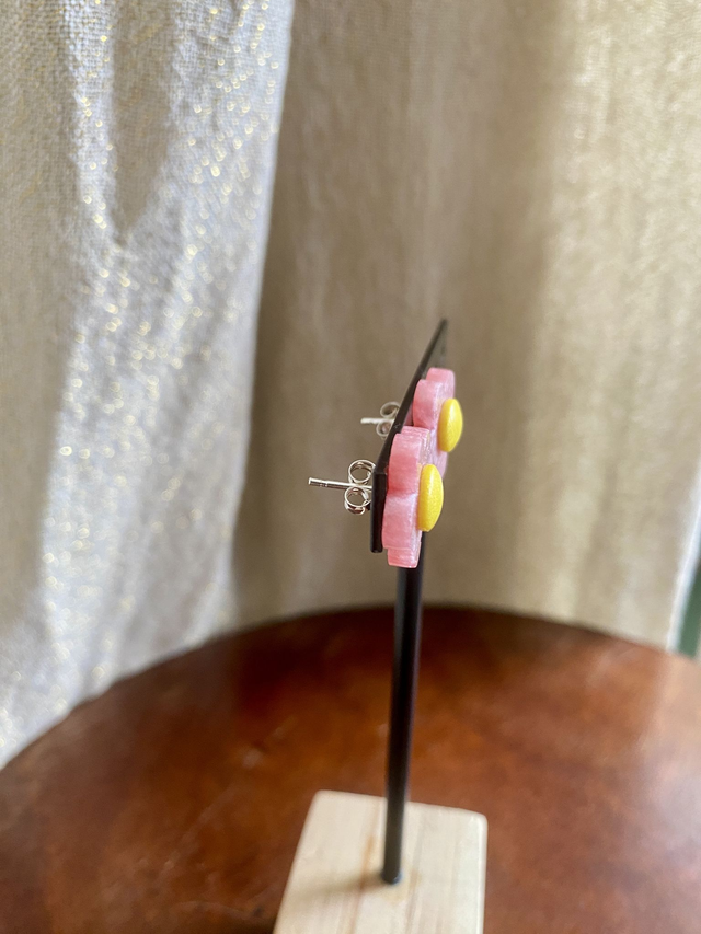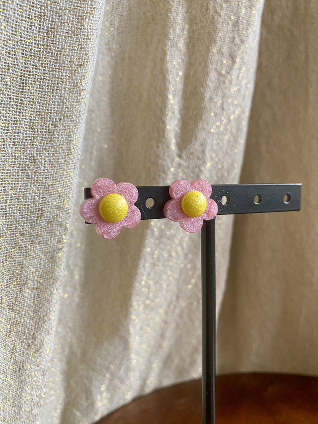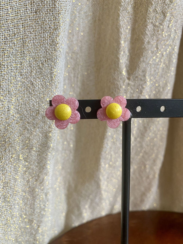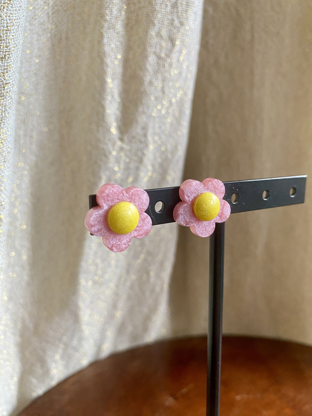 Puces en argent 925, modèle fleur. Pigments bébé rose et jaune.