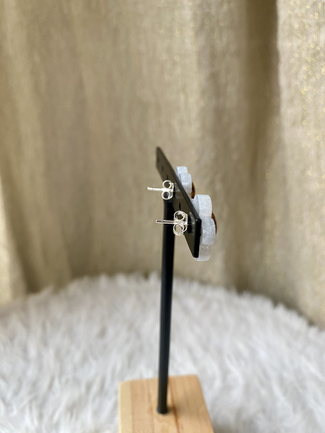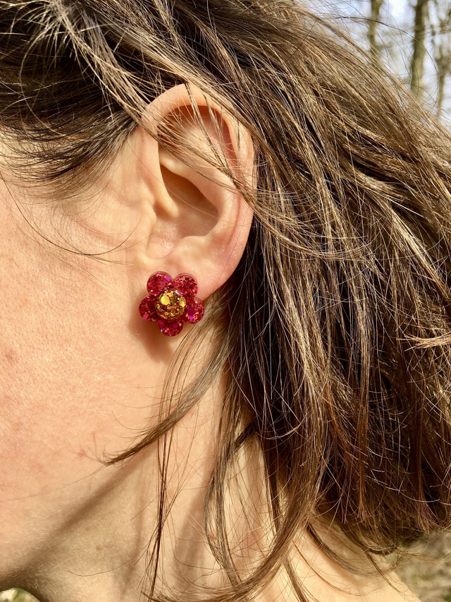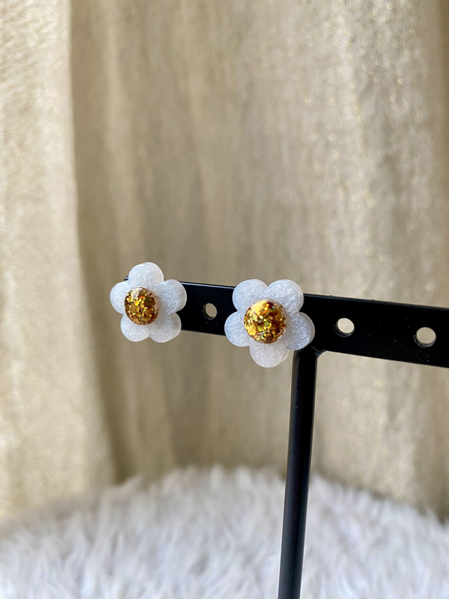 Puces en argent 925, modèle fleur. Pigments snowflake et paillettes chunky or.