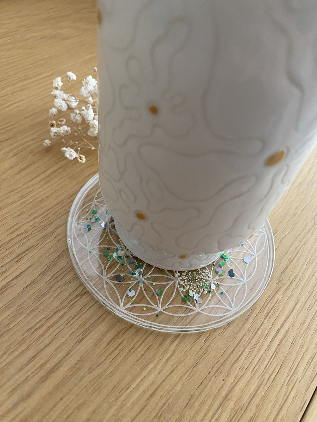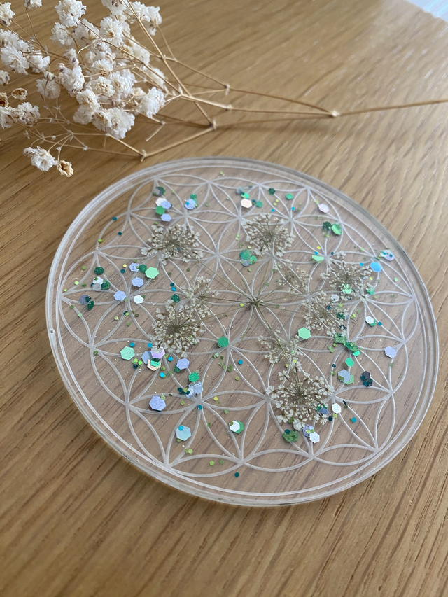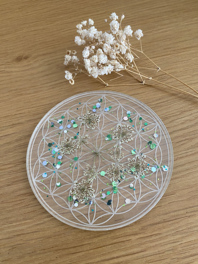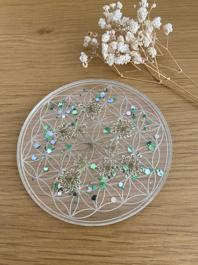 Dessous de verre en forme de fleur de vie, incrusté de fleurs de carotte sauvage et paillettes mojito.